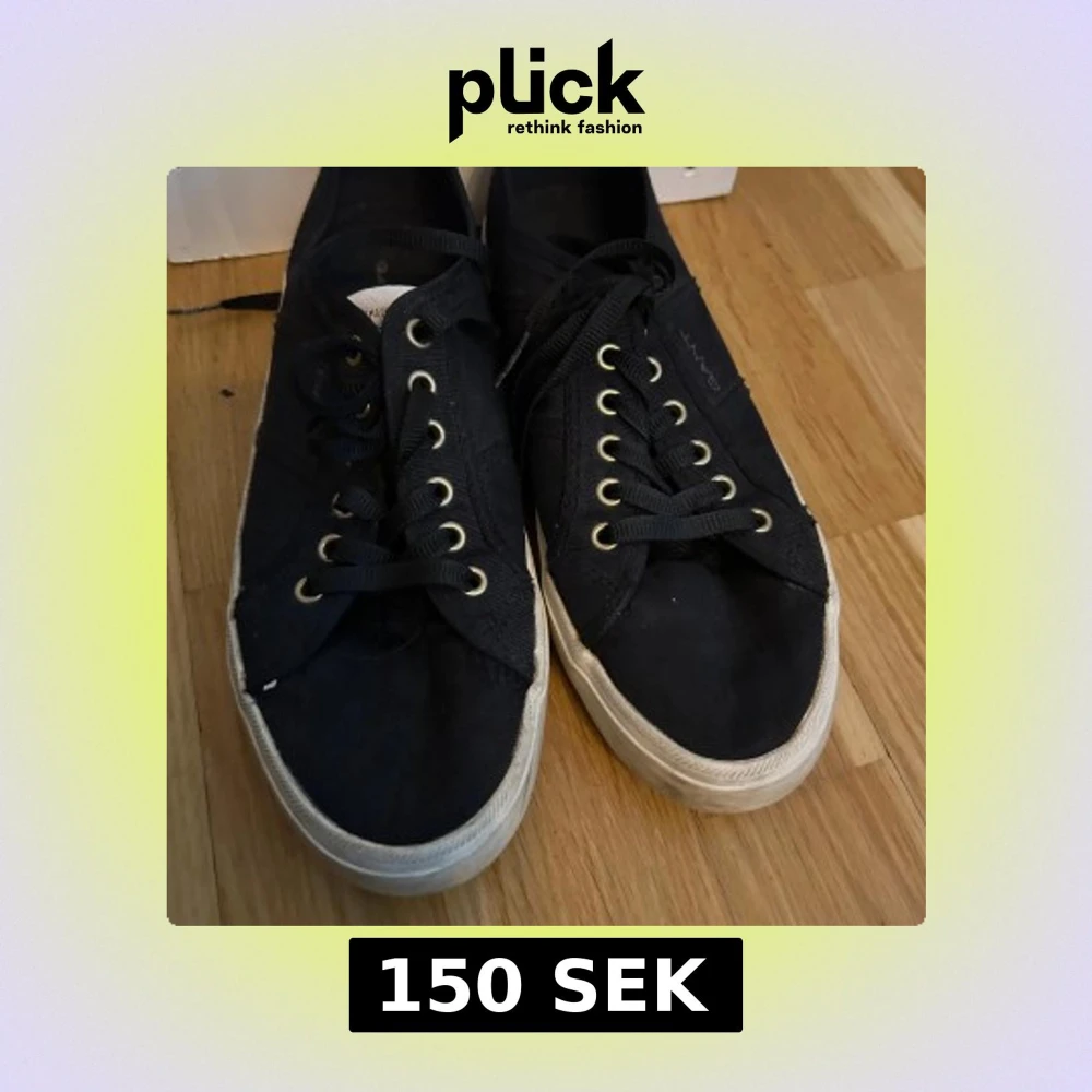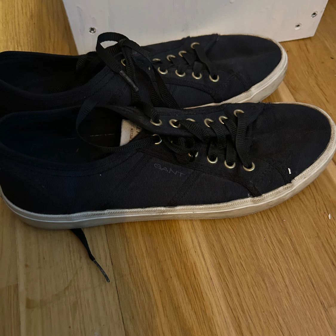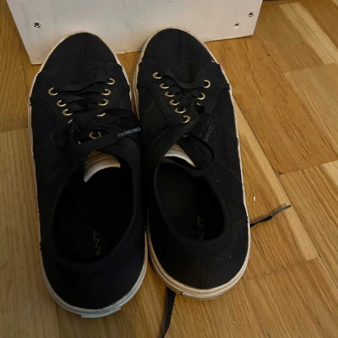 Säljer ett par svarta sneakers från Gant i canvas med vita sulor och guldfärgade öljetter. Klassisk låg modell med snörning och rund tå. Perfekta till jeans eller shorts för en chill look. Bra skick använd ett fåtal gånger