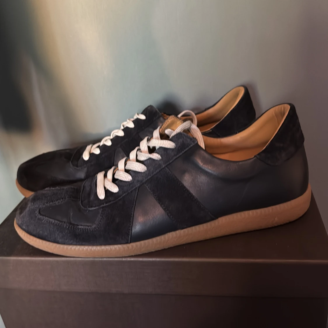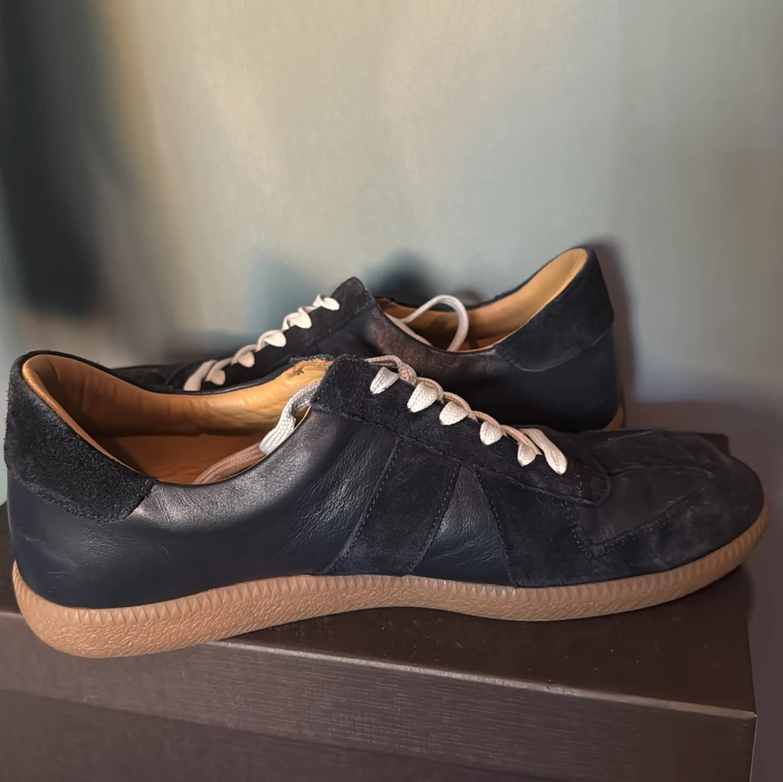 Snygga marinblå GAT skor från Skolyx med ovandel i både mocka och skinn, vita snören och klassisk gummisula i beige. Skorna har en stilren och tidlös design med rund tå och diskreta paneler. Pris går att diskutera!