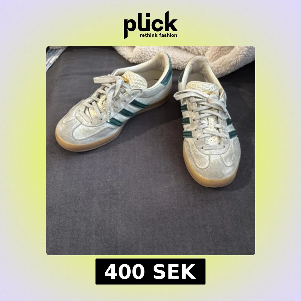 Gazelle Adidas sneakers med klassiska gröna ränder på sidan. Skorna har en gummisula och snörning framtill. Perfekta för en avslappnad stil. Det finns en defekt, skorna har tvättats vilket ledde till att den gröna färgningen fick hela vita skon att bli grå/beigeaktig som det syns på bilderna.