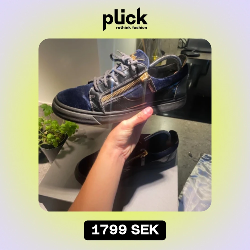 Ett par snygga blå svarta Giuseppe Zanotti. Dom är i ett 7.5/10 i skick. Allt og finns kvar. Ny pris 4850kr. Om det är något mer är det bara att skriva privat.