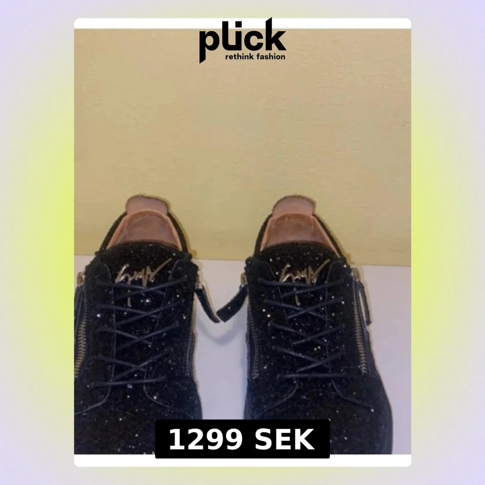 Säljer ett par svarta sneakers från Giuseppe Zanotti med glittrigt material och snygga silverfärgade dragkedjor på sidorna. Skorna har snörning, rund tå och platt sula. Perfekta för dig som gillar att sticka ut med lite extra bling på fötterna.