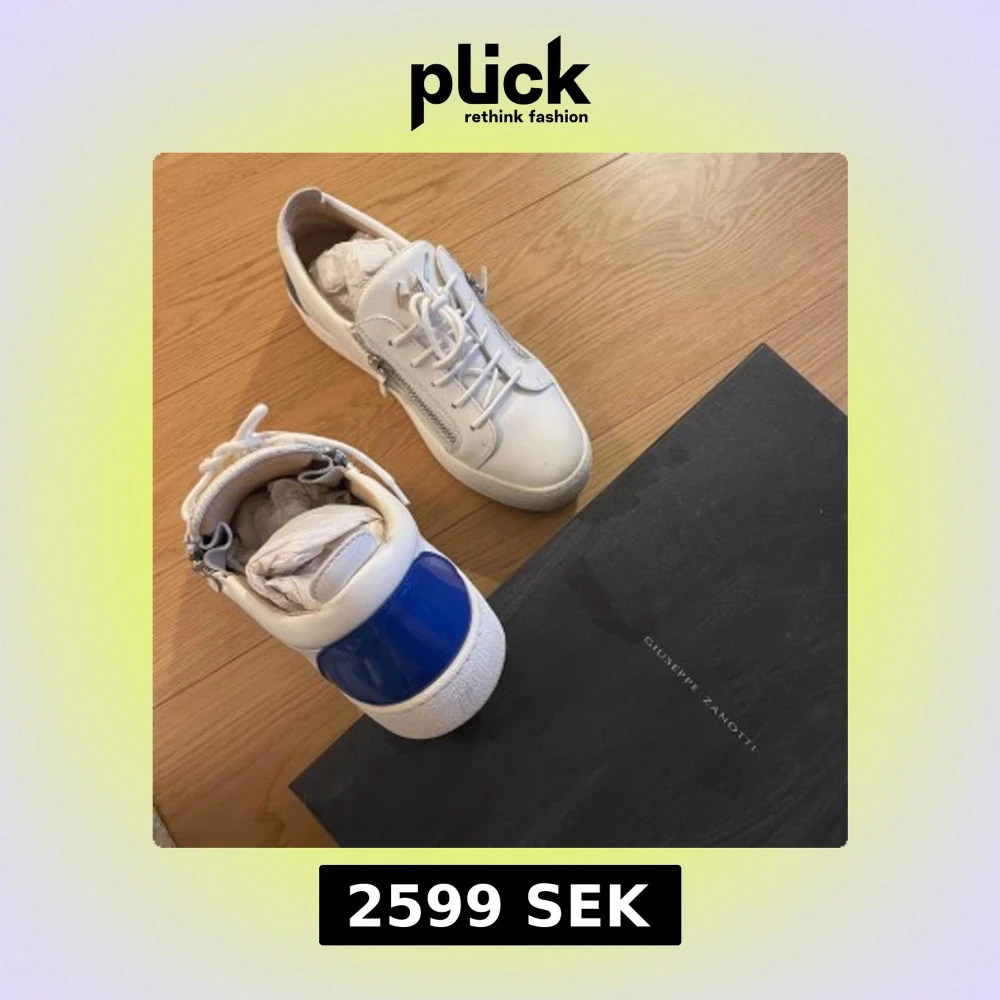 Säljer ett par vita sneakers från Giuseppe Zanotti med blå hälpanel, snörning och silverfärgade dragkedjor på sidorna. Skorna har en platt sula och är tillverkade i skinn med metallisk logga på plösen. Riktigt snygga och unika detaljer som sticker ut.
