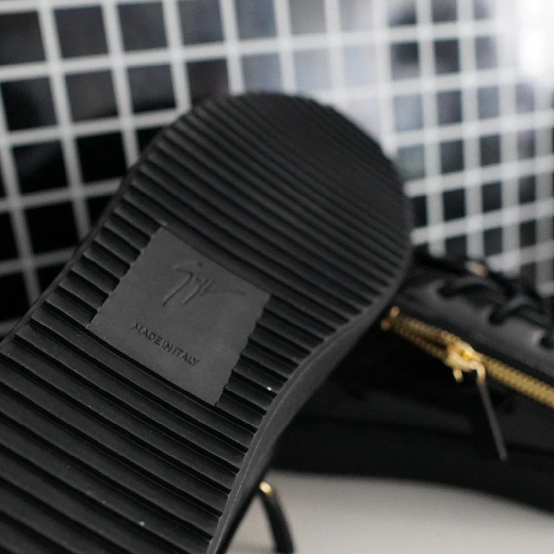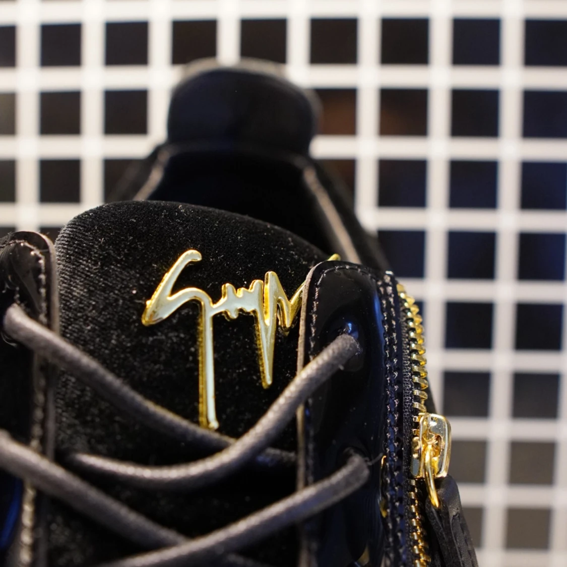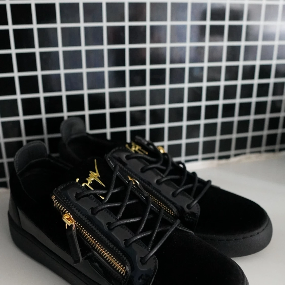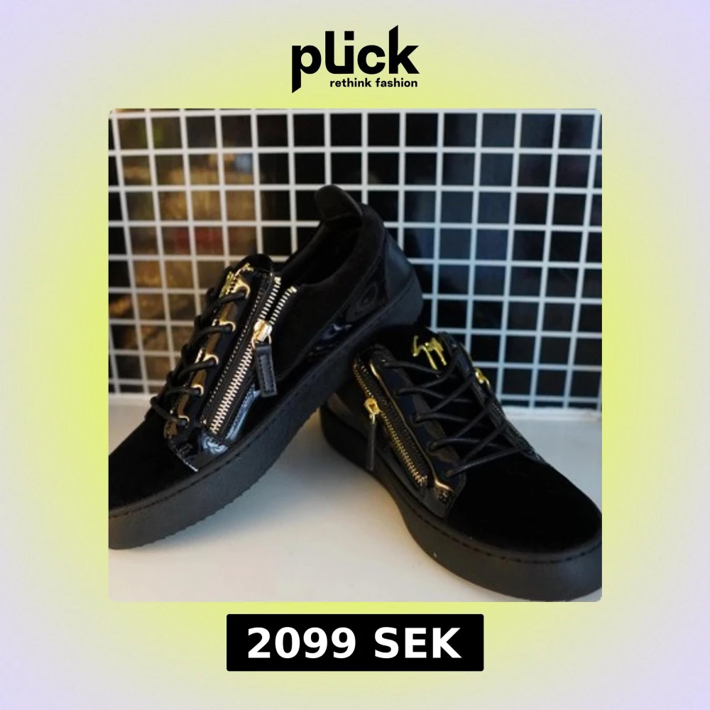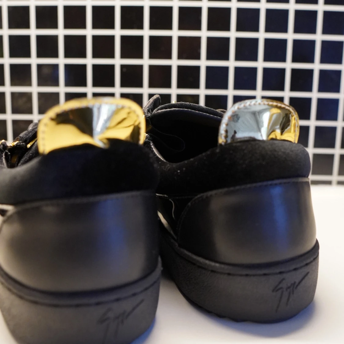 Snygga svarta sneakers från Giuseppe Zanotti med lyxiga gulddetaljer, dragkedjor på sidorna och signaturlogo på plösen. Skorna har en mix av mocka och skinn, platt sula och snörning. Perfekta för dig som vill sticka ut med exklusiv streetstyle. Str 41, pris går att diskutera