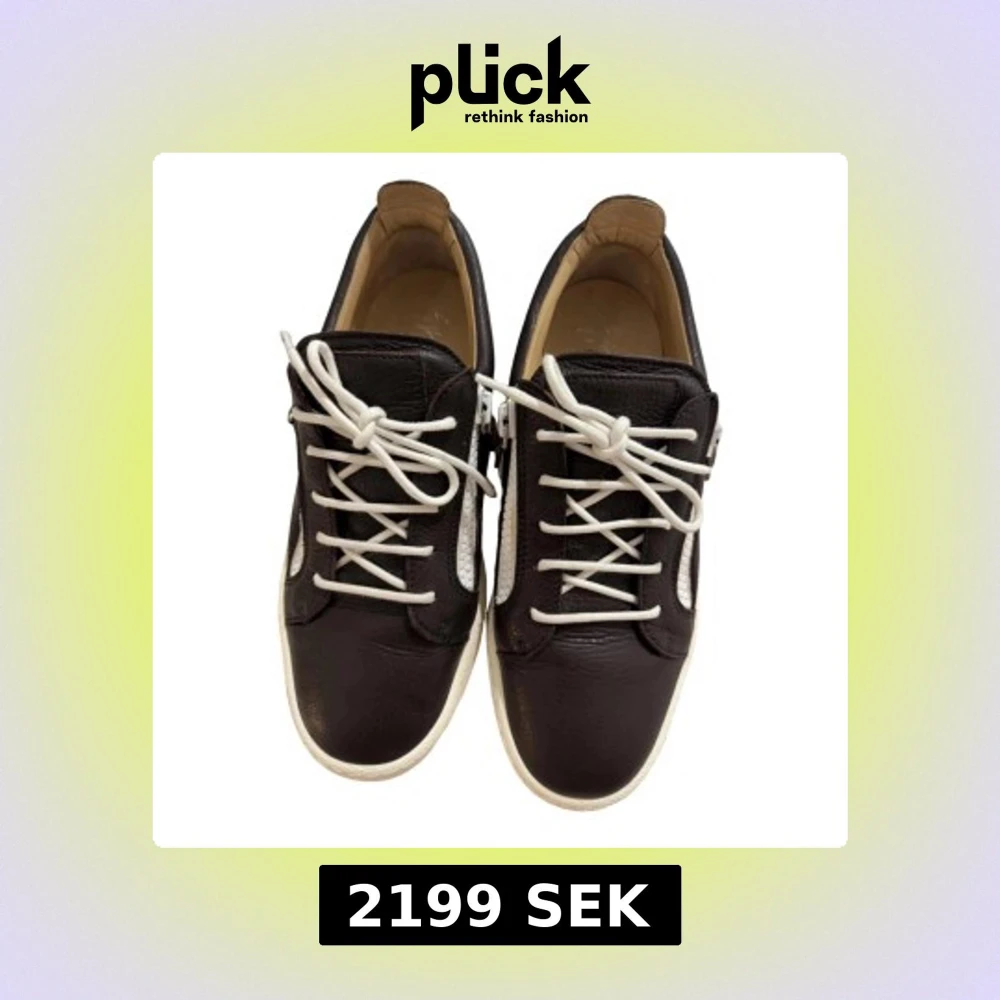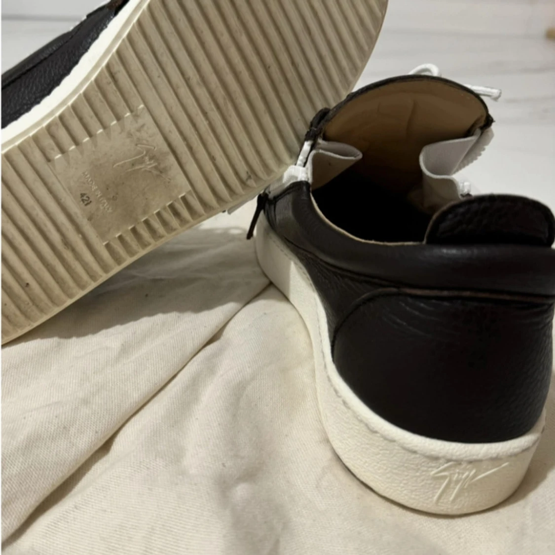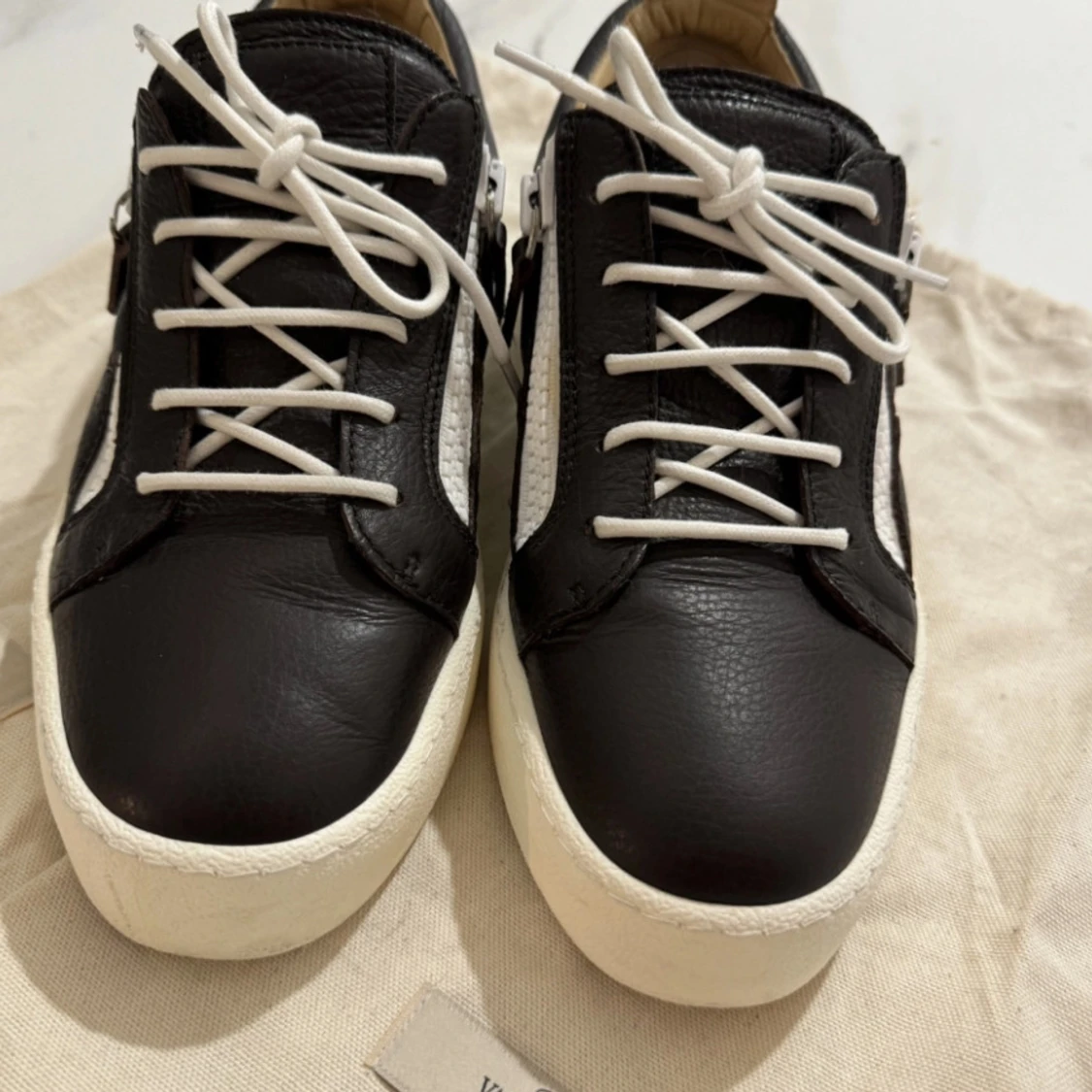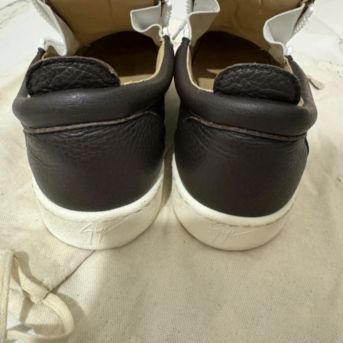 Snygga bruna sneakers från Giuseppe Zanotti i skinn med vita detaljer och vita snören. Skorna är i extremt bra skick och självklart äkta. Vid minsta fundering är det bara att skriva