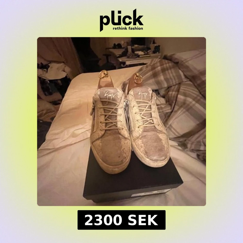 Säljer ett par feta sneakers från Giuseppe Zanotti i vitt skinn med ormmönstrad struktur. Skorna har snörning, dragkedjor på sidorna och den ikoniska loggan på plösen. Riktigt snygga detaljer köpta i somras jätte fina skor har allt som ingår
