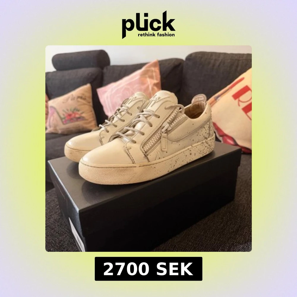 Unika sneakers från Giuseppe Zanotti i skinn med coolt stänkmönster i svart och dragkedjor på sidorna. Väldigt varsamt använt, mycket fint skick. Nypris på skorna låg på 6500kr. Klassisk rund tå, platt sula och snörning framtill. Perfekta för dig som gillar unika detaljer och streetstyle-vibe.