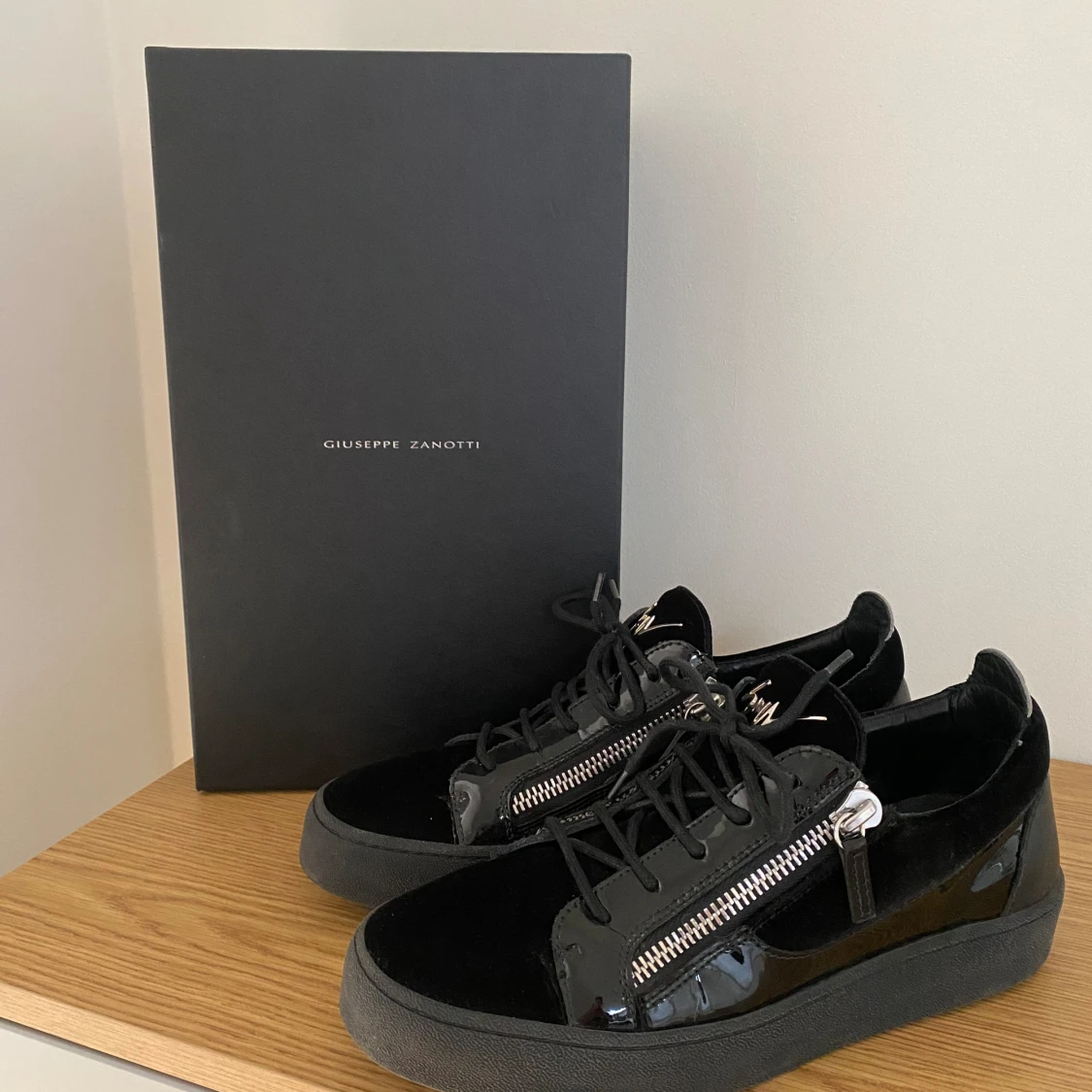 Skor från Giuseppe Zanotti. Mycket bra skick, använda fåtal gånger. Skorna är självklart äkta. Allt på bilden medföljer. Storlek 42, passar mellan 41-43. Öppen för byten! Hör av er vid funderingar✅