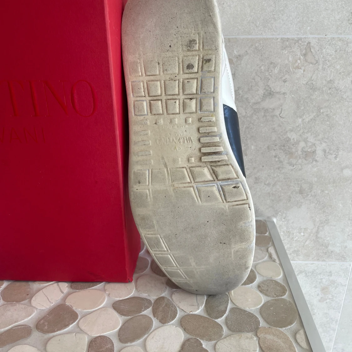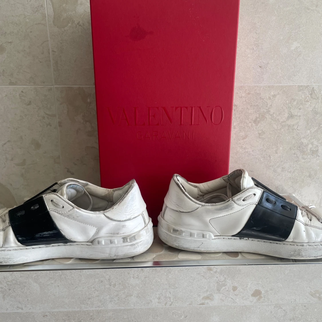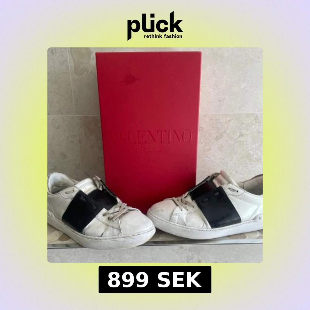 Snygga vita sneakers från Valentino Garavani med bred svart detalj över sidan. Skorna har rund tå, snörning och är tillverkade i skinn. Klassisk och stilren design som passar till det mesta. Kommer med originalröd box.6/10 skick hör av vid frågor