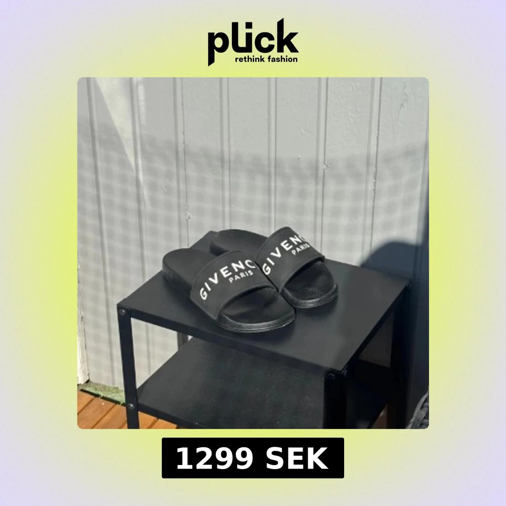 Svarta slides från Givenchy med vit logotyp på bred rem över foten. Klassisk och stilren design, perfekt för sommardagar eller chill hemma. Tillverkade i syntetmaterial med platt sula och öppen tå.