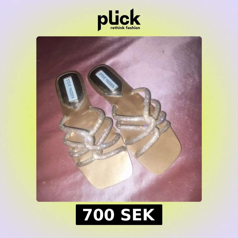 Säljer ett par snygga sandaler från Steve Madden i beige med glittriga remmar. Skorna har fyrkantig tå och flera tunna remmar täckta av små strass-stenar som ger en riktigt lyxig vibe. Perfekta för att lyfta vilken outfit som helst. Aldrig använda