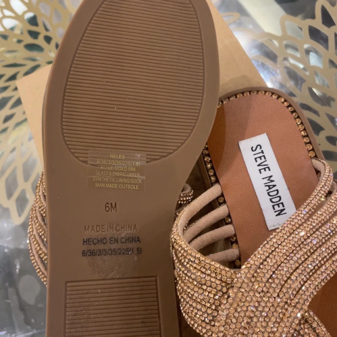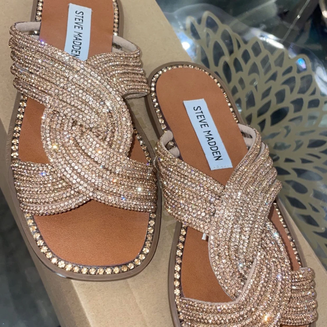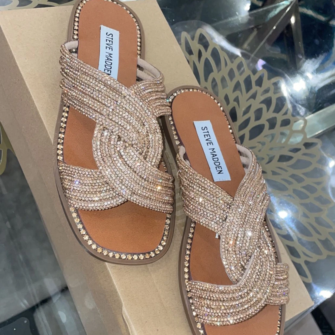 Snygga sandaler från Steve Madden med glittriga detaljer i guld. De har en korsad design över foten och en bekväm sula. Perfekta för att ge en touch av glamour till din outfit. Storlek 36