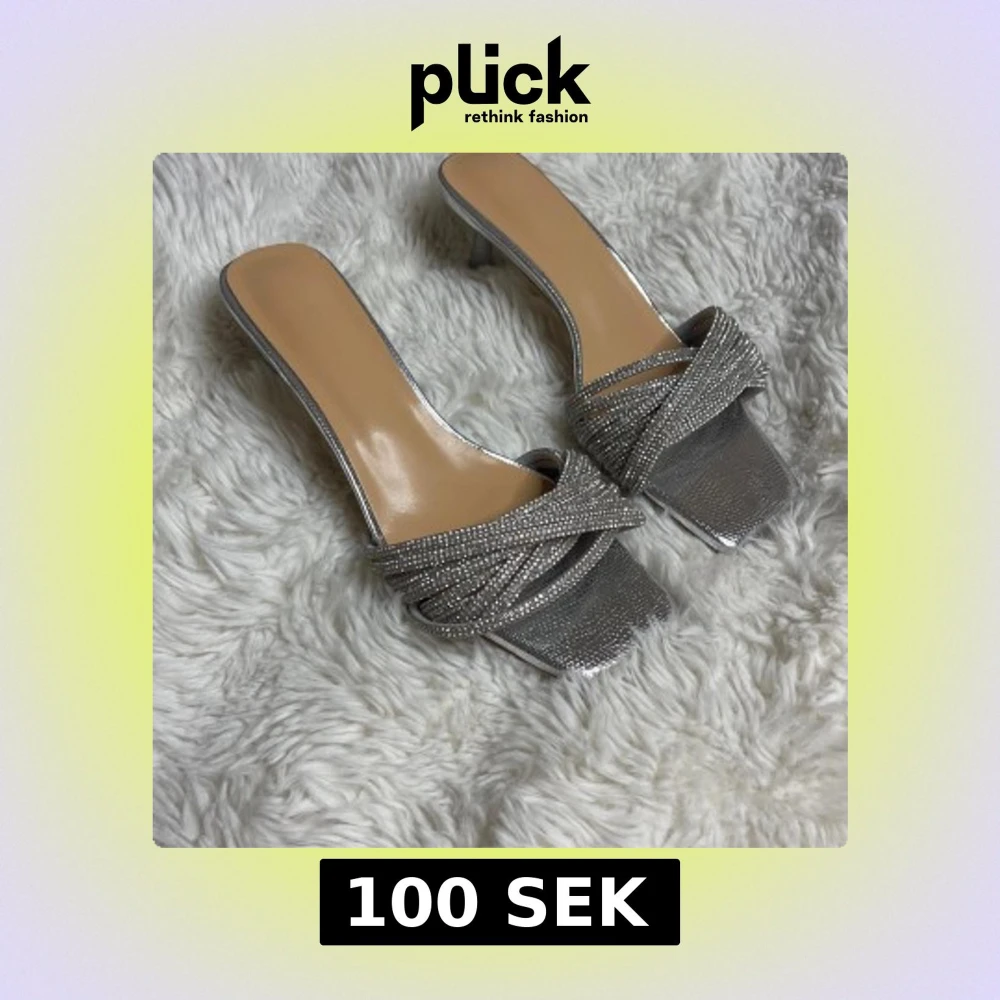 Snygga klackar i silver med glittriga detaljer och tvinnade remmar över foten. Skorna har öppen tå, fyrkantig tåform och låg klack. De är från shein men har endast använt en gång och de är i bra kvalitet.