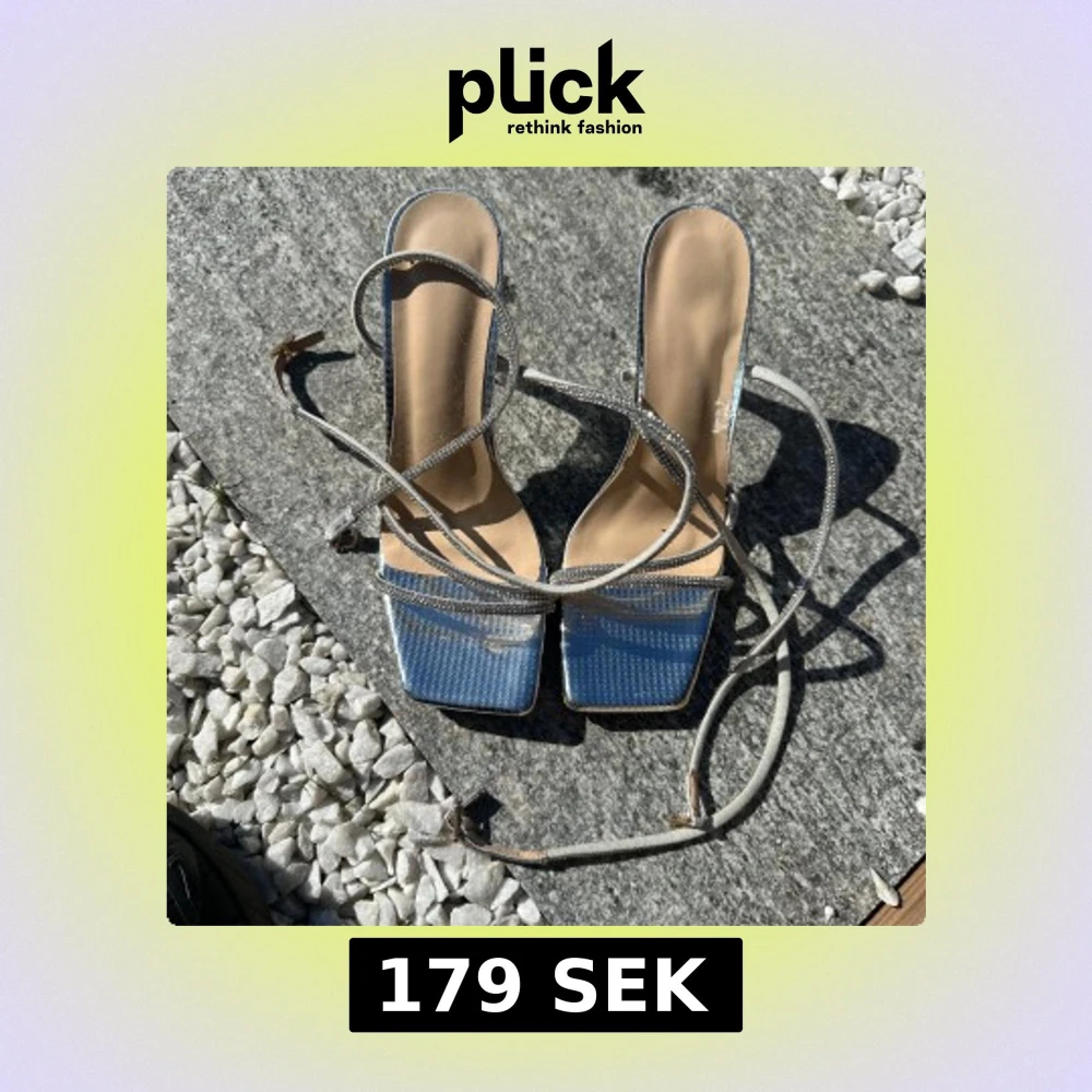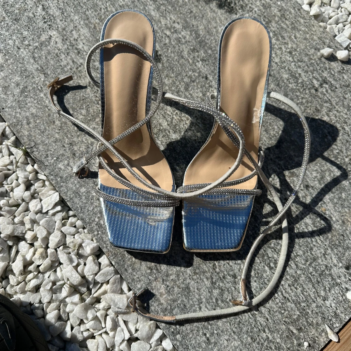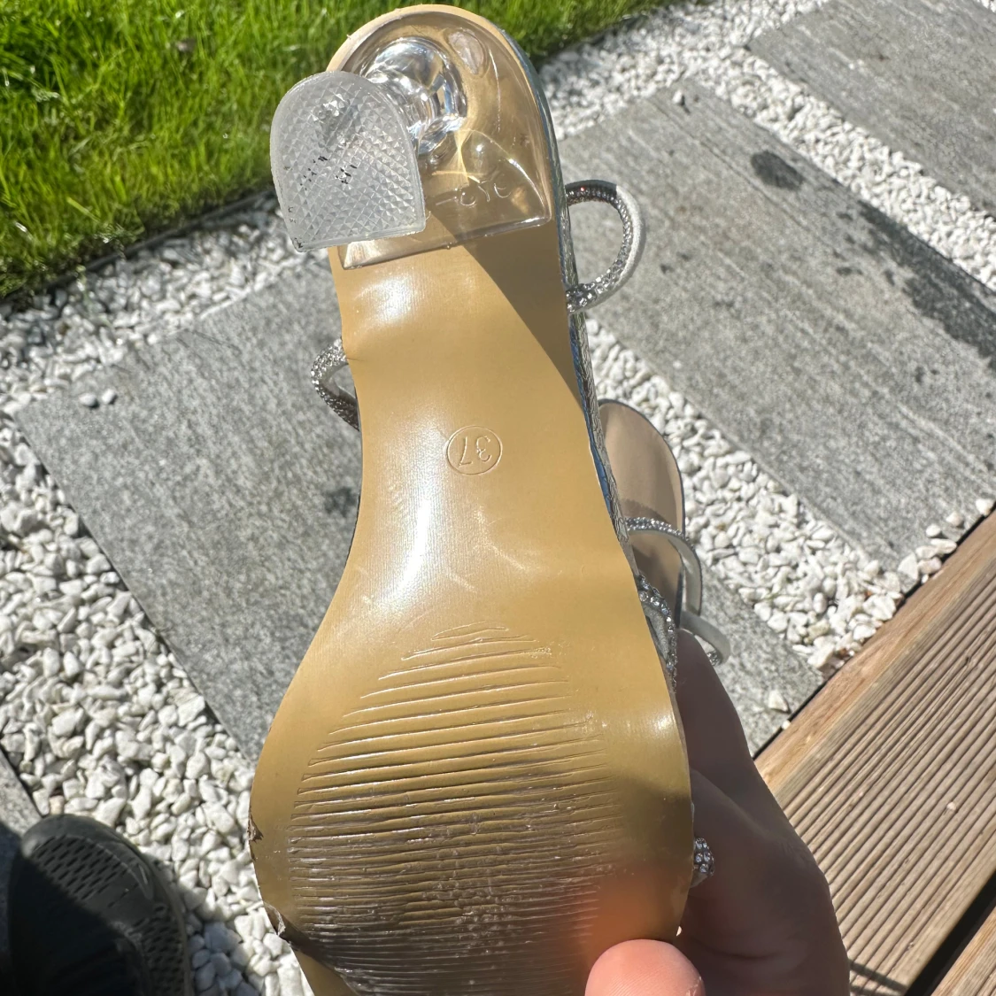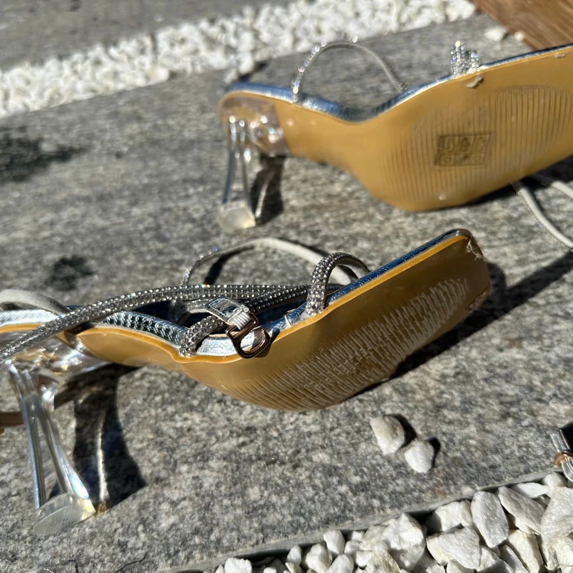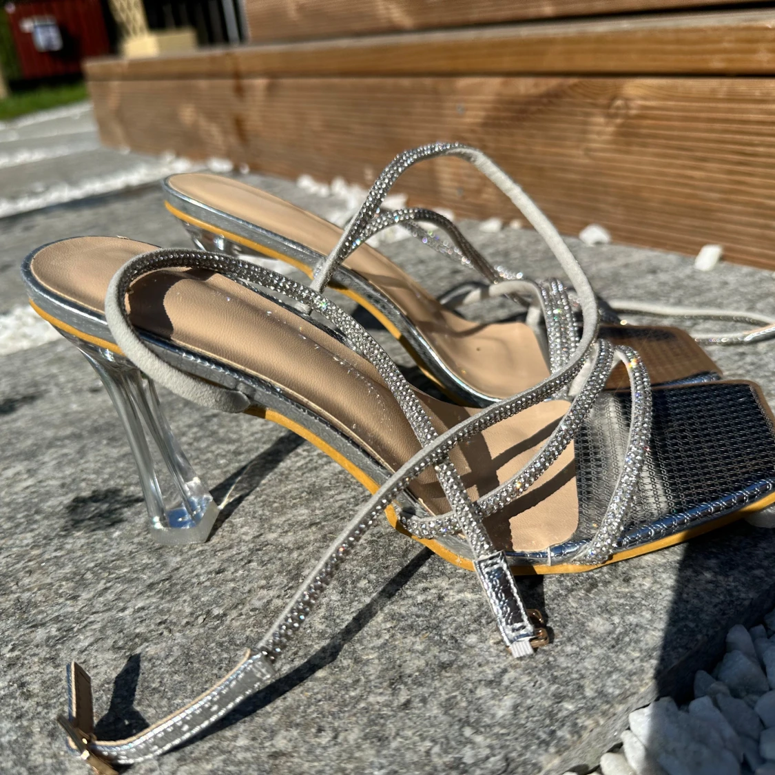 Säljer ett par sandaler med glittriga silverremmar och fyrkantig tå. Skorna har transparent klack och tunna remmar som går att snöra runt vristen. Perfekta för dig som vill sticka ut lite extra.