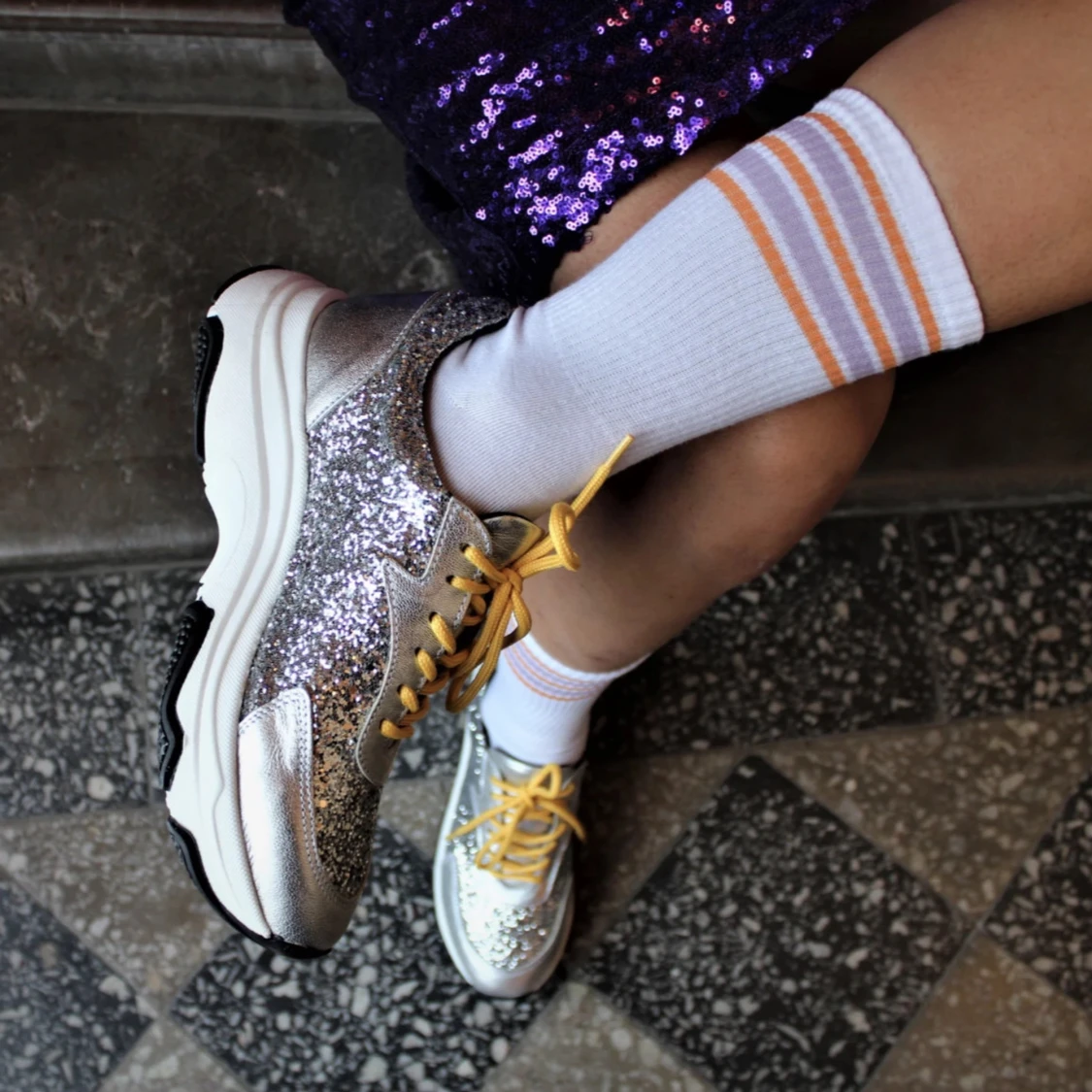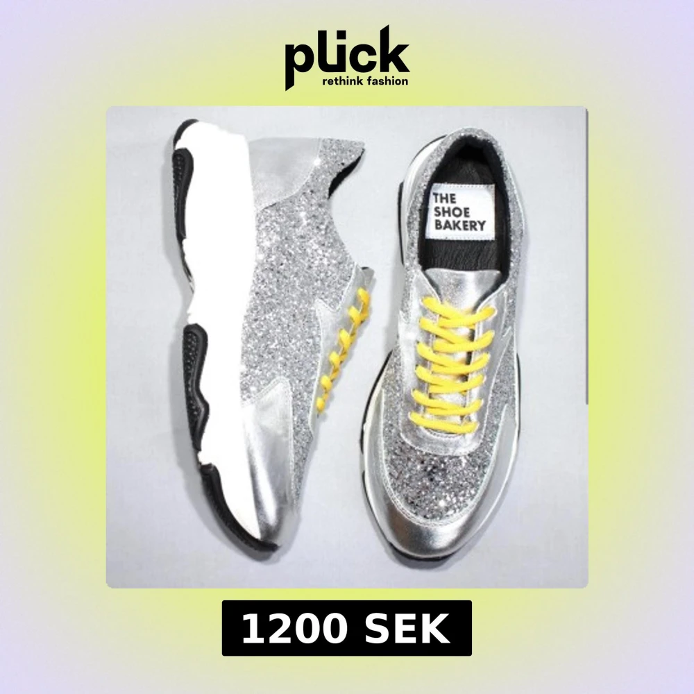 Snygga sneakers i silver med glittrig yta och gula snören från The Shoe Bakery. Köpta för 2200, använda väldigt få gånger (2-3 gånger)