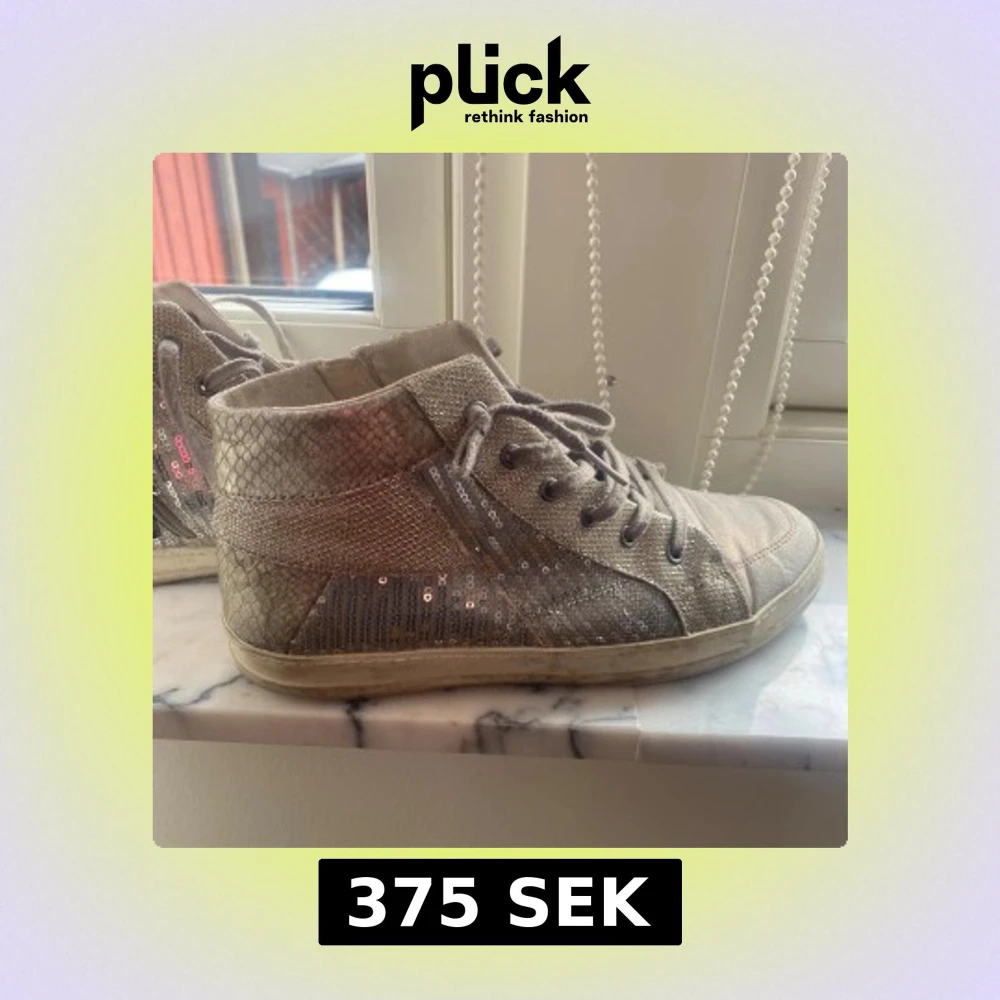 Snygga sneakers i beige med glittriga paljettdetaljer. Skorna har snörning och en dragkedja på sidan.