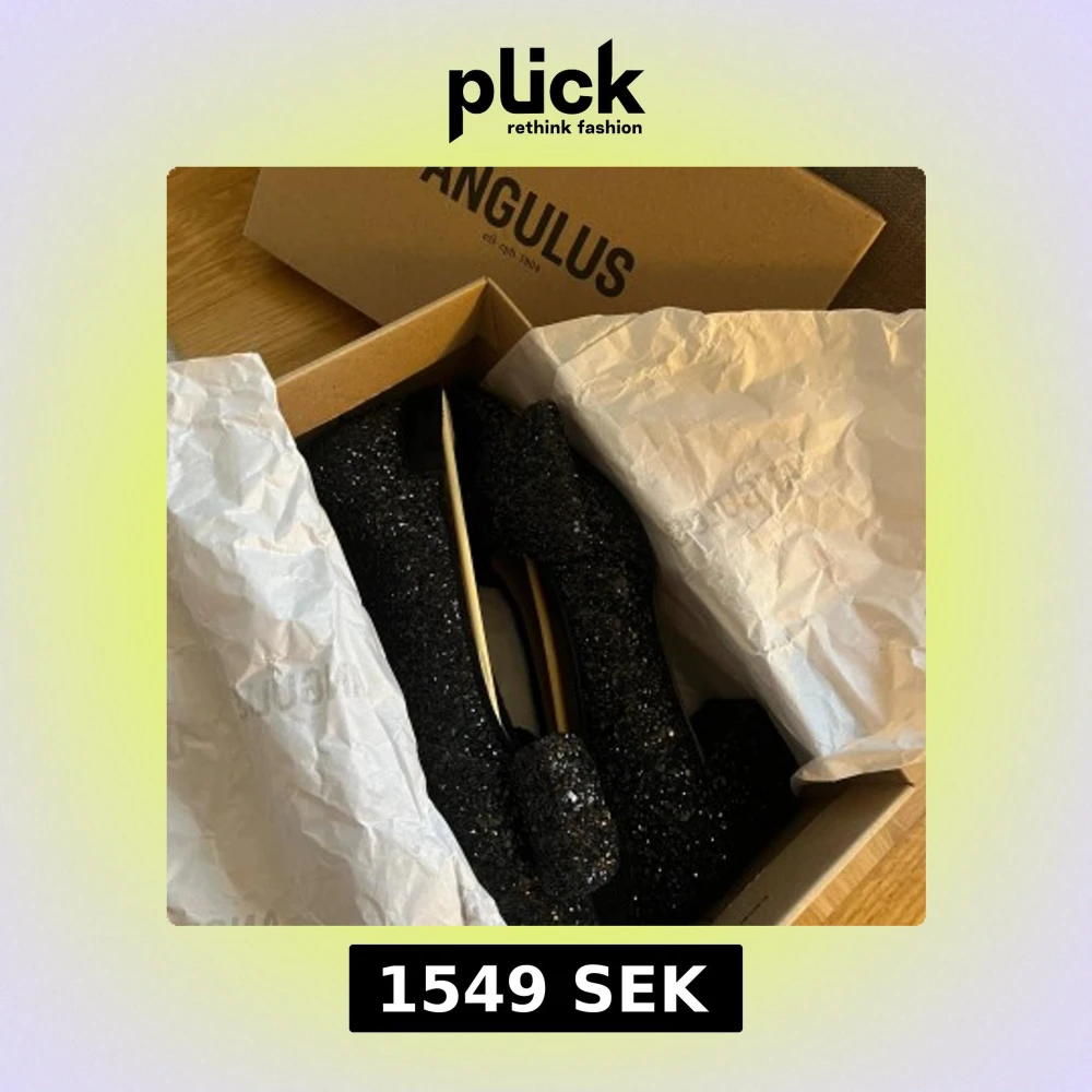 Säljer ett par svarta pumps från Angulus med glittrigt material och stor rosett framtill. Skorna har spetsig tå och en stabil, medelhög klack som ger extra attityd. Perfekta för dig som vill sticka ut med en glamorös look.
