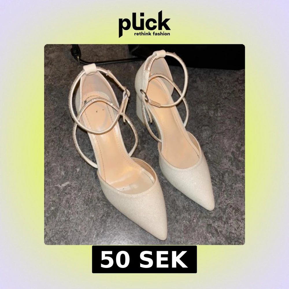 Säljer ett par vita pumps med glittrig finish, spetsig tå och bred blockklack. Skorna har dubbla remmar runt ankeln, varav en är dekorerad med små stenar för extra bling. Perfekta för dig som vill sticka ut med stilrena detaljer och snygg passform.