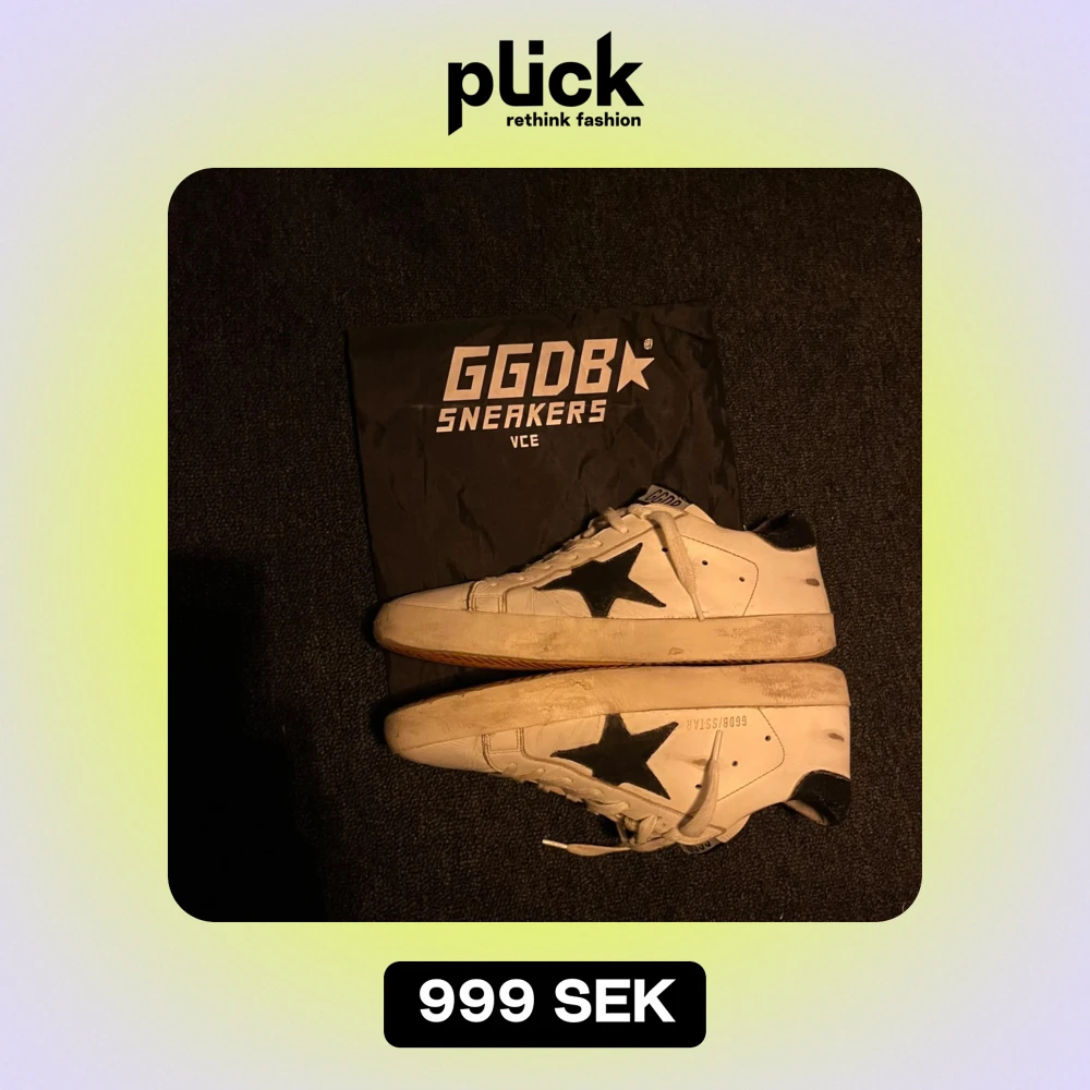 Säljer ett par Golden Goose sneakers i vitt med en svart stjärna på sidan. De har en sliten look,🤩 Skorna har en dustbag som följer med och skorna är i helt okej skick✅, perfekta för både vardag och fest. Storlek är 41 men passar 42 också, Hör av er vid funderingar⭐️