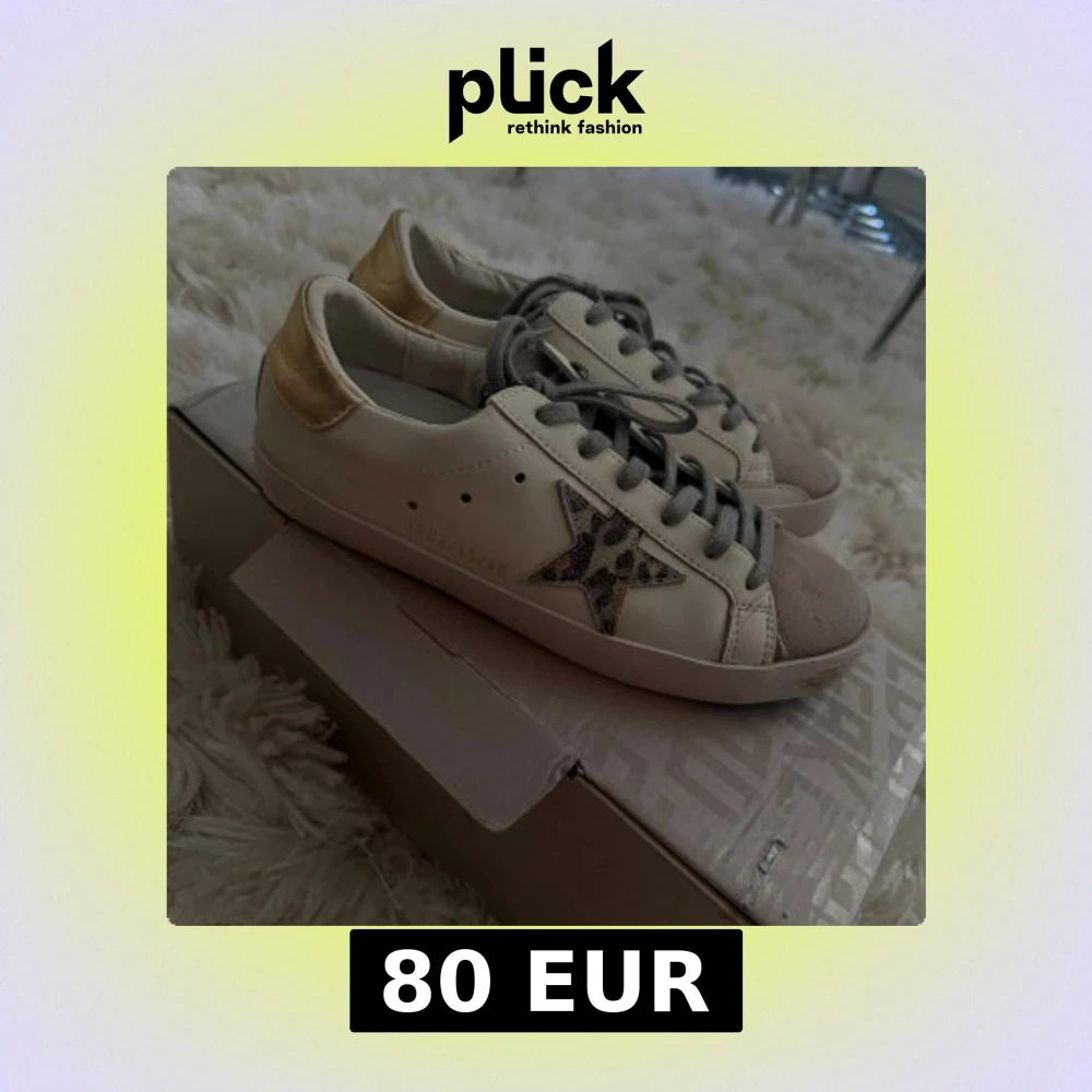 Helt underbara gyllene gåsskor i storlek 39! Leopardmönstrad stjärna och guldfärgad metallic baksida, där texten har slitits bort naturligt. Skorna ser riktigt bra ut på utsidan och är annars i gott skick förutom det naturliga slitaget på sulorna! Ett typiskt problem med gyllene gåsskor är slitage på sulorna, vilket har hänt även med dessa, men det är mest märkbart på skospetsen. Spetssulorna har limmats fastare, men en skomakare skulle nog veta hur man åtgärdar problemet bättre. ❤️