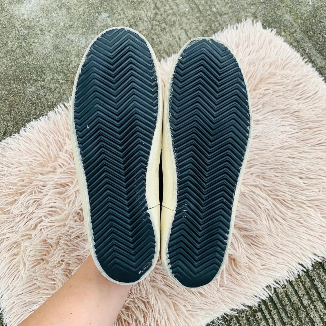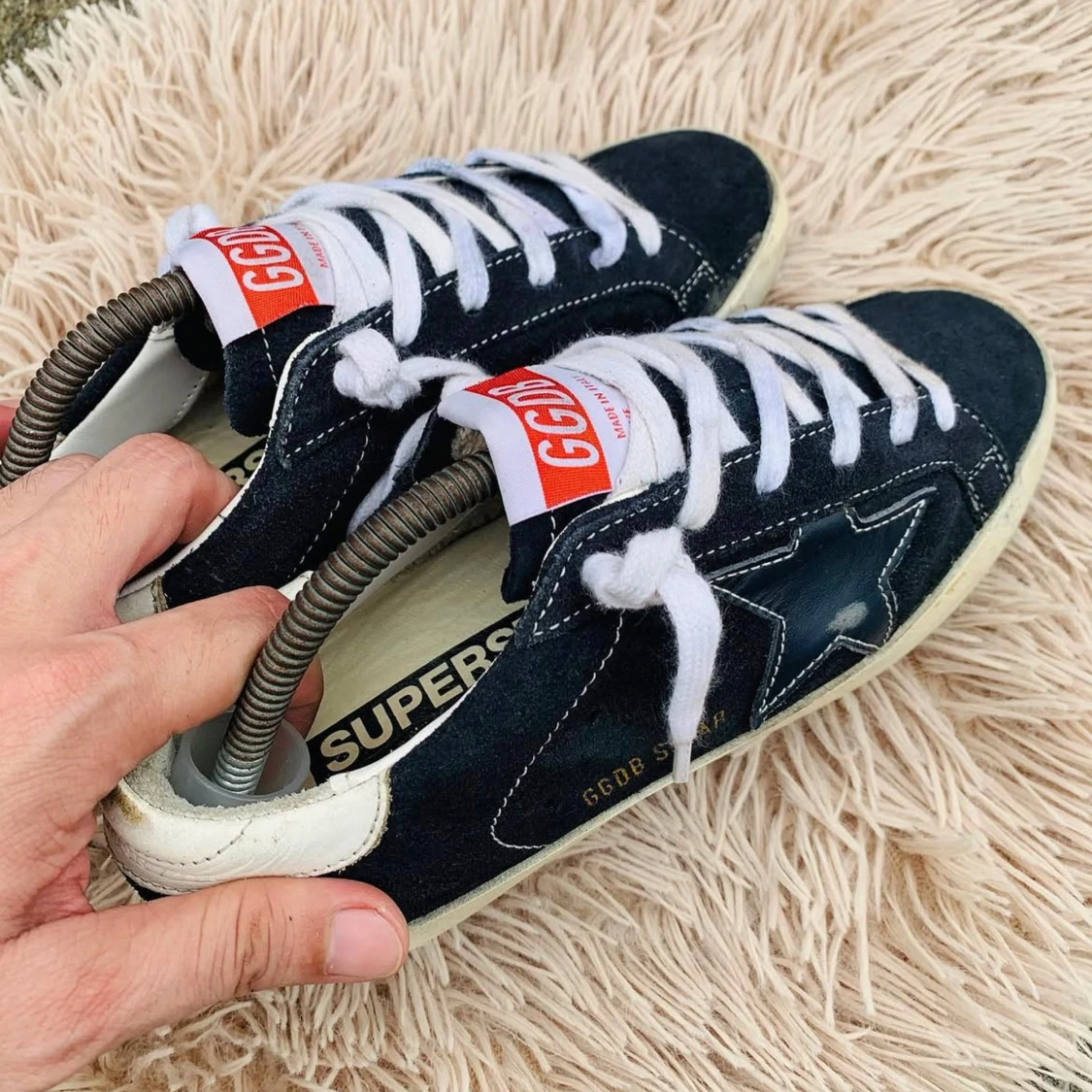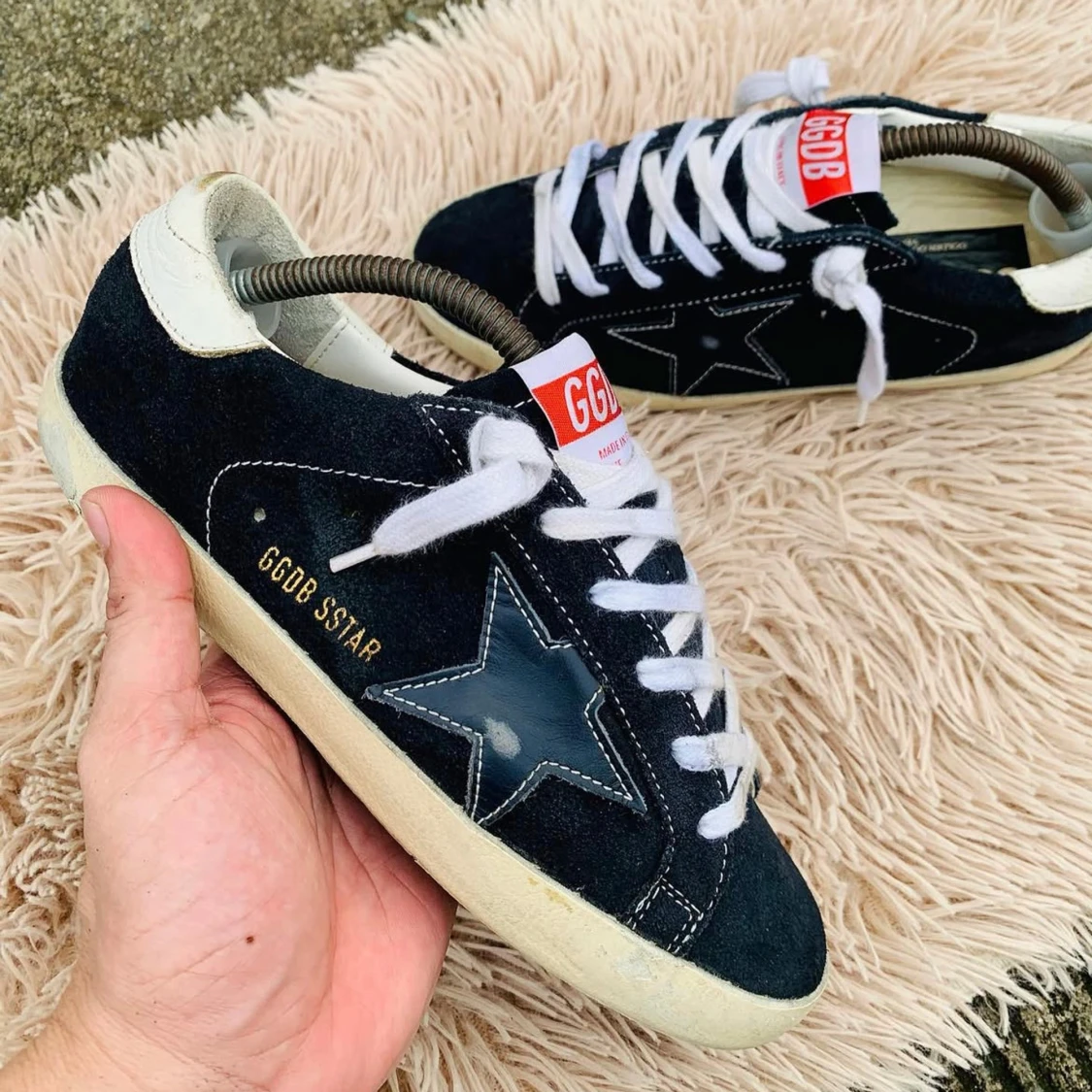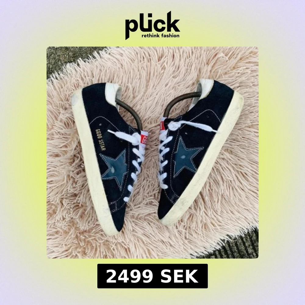 Snygga svarta sneakers från Golden Goose med vit sula och stjärndetalj på sidan. Skorna har vita snören och en röd etikett på plösen. Perfekta för en avslappnad stil.