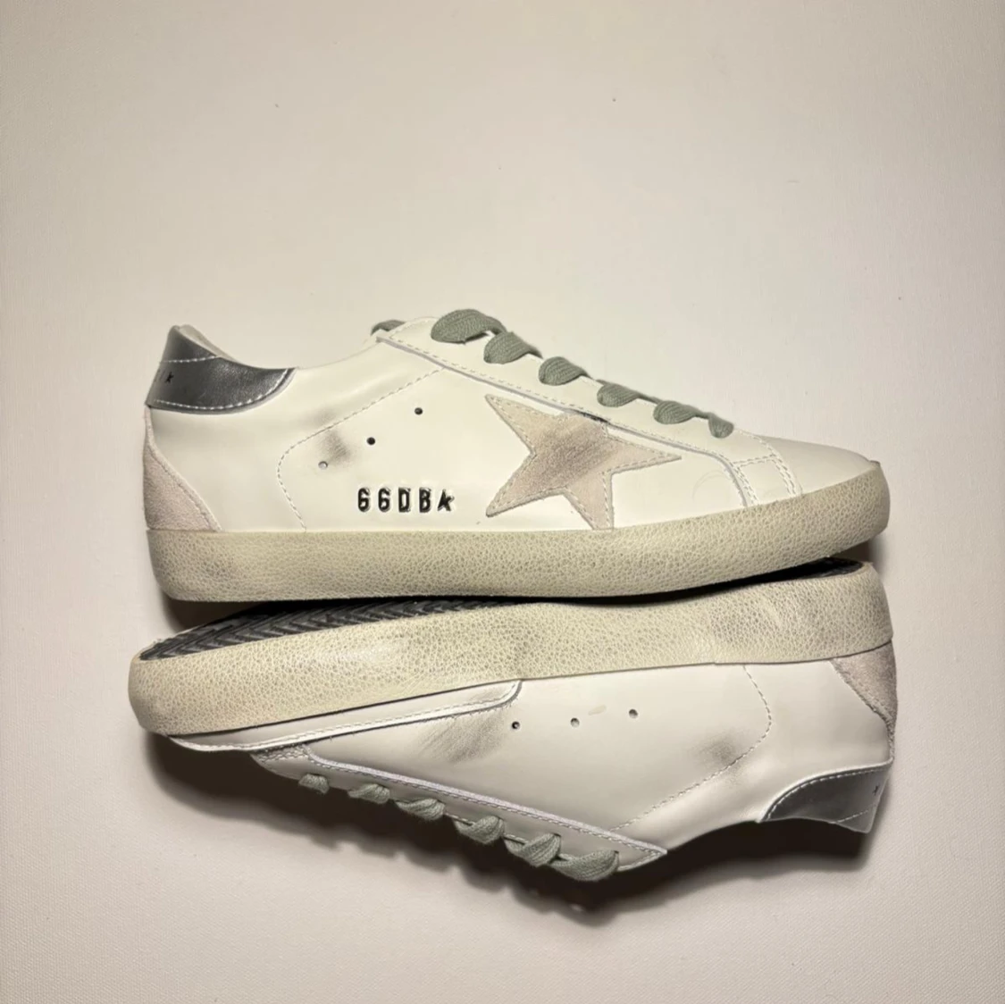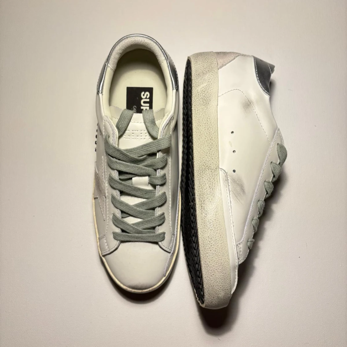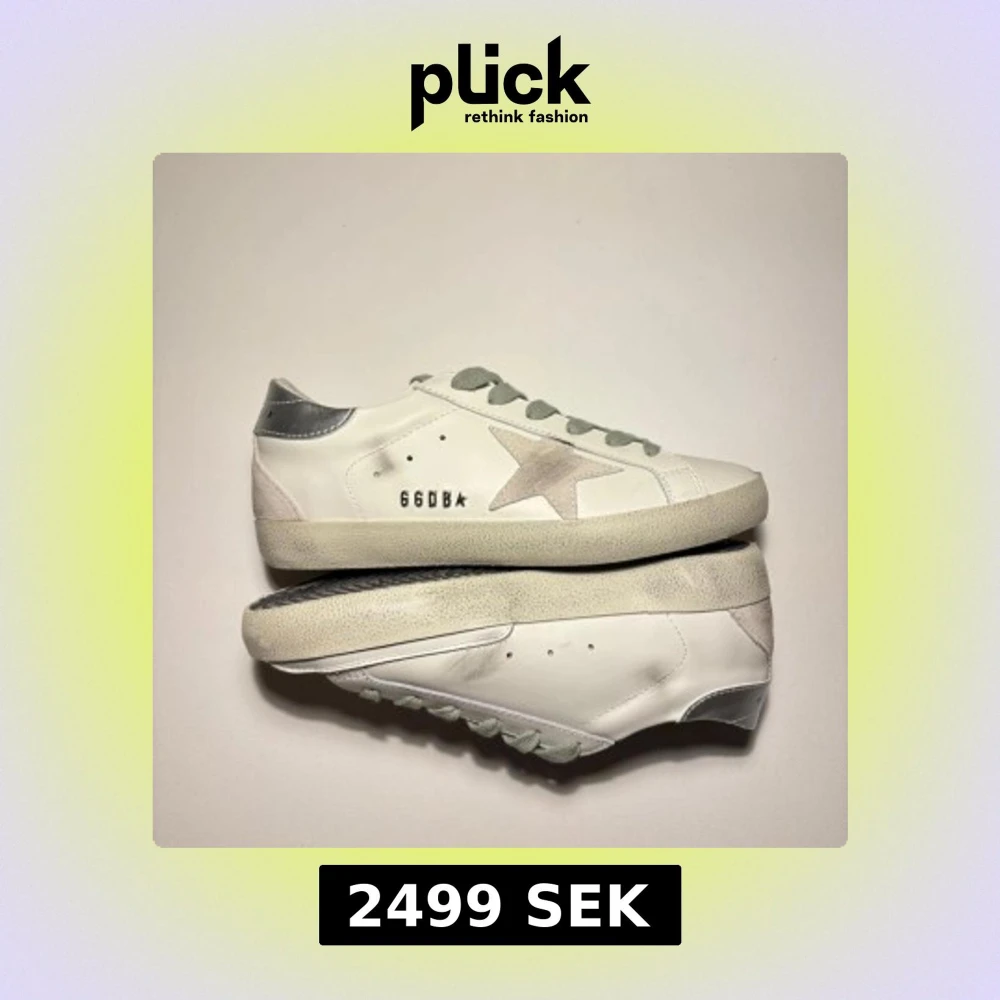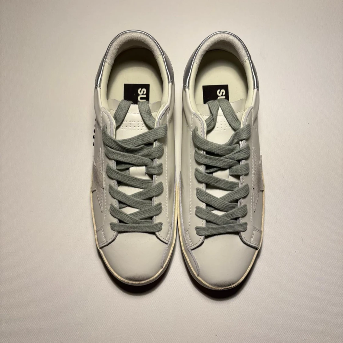 Snygga vita sneakers från Golden Goose med grå snörning, silverfärgad häl och ikonisk stjärndetalj i mocka på sidan. Skorna har en platt sula och är tillverkade i skinn med detaljer i mocka. Perfekta för en cool och avslappnad stil. De är helt nya