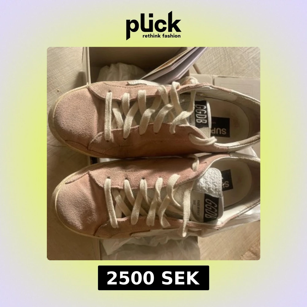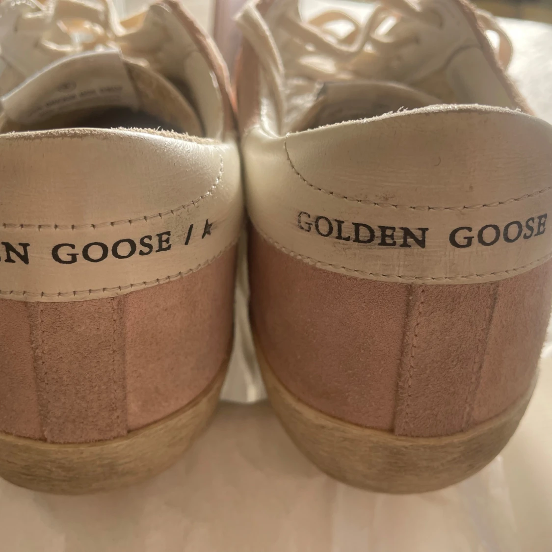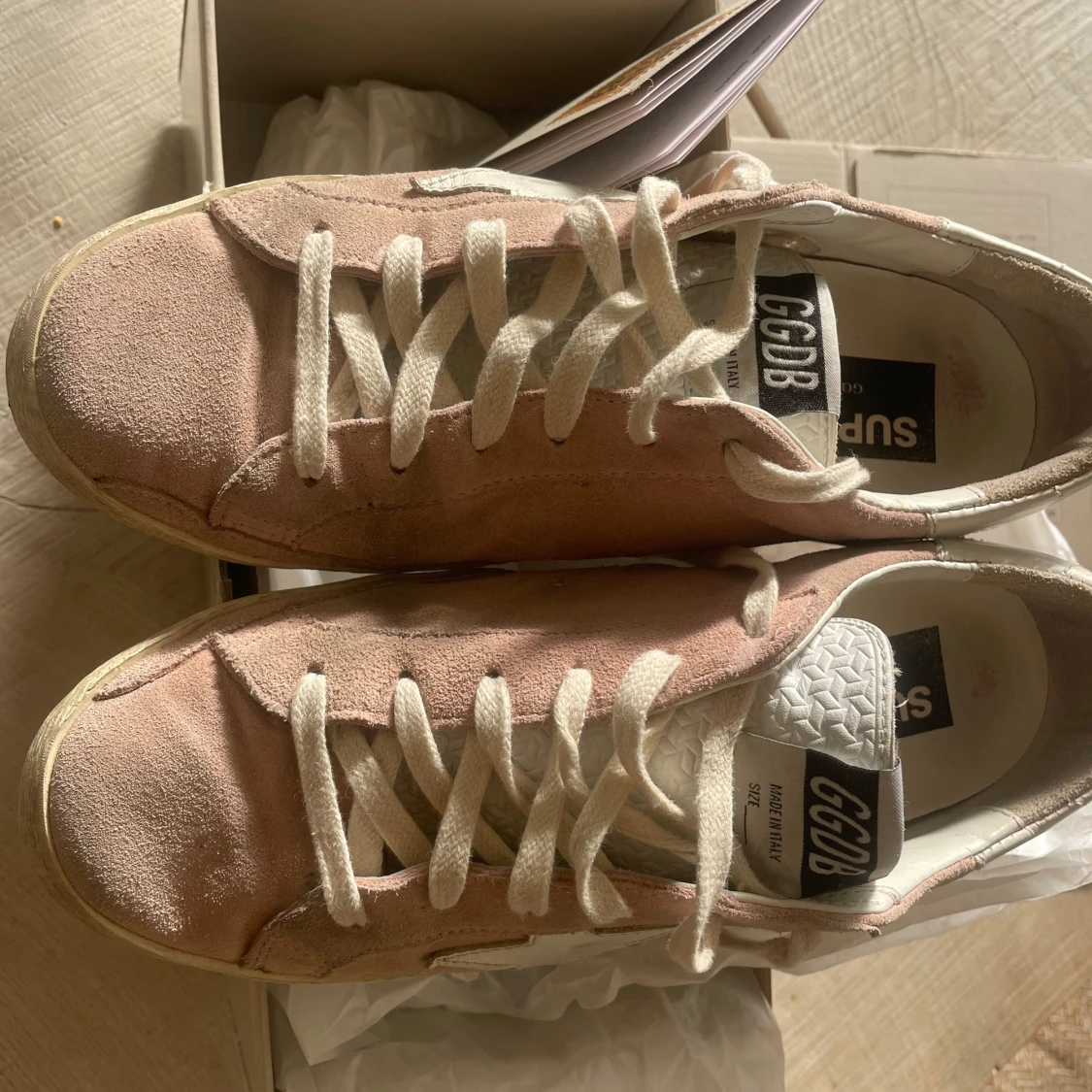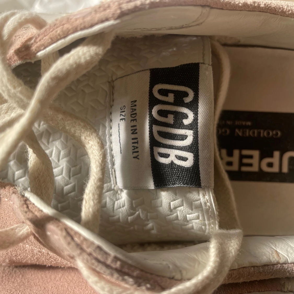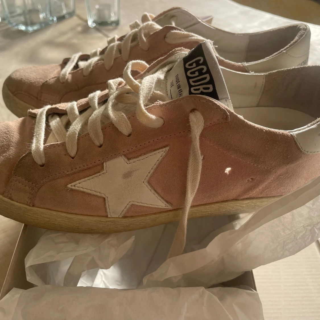 Golden Goose sneakers i ljusrosa mocka med vit stjärna på sidan och vita skinnpartier vid hälen. Klassisk rund tå, vita snören och platt sula. GGDB-logga på plösen och hälen. Stora i storleken, passar 38or.