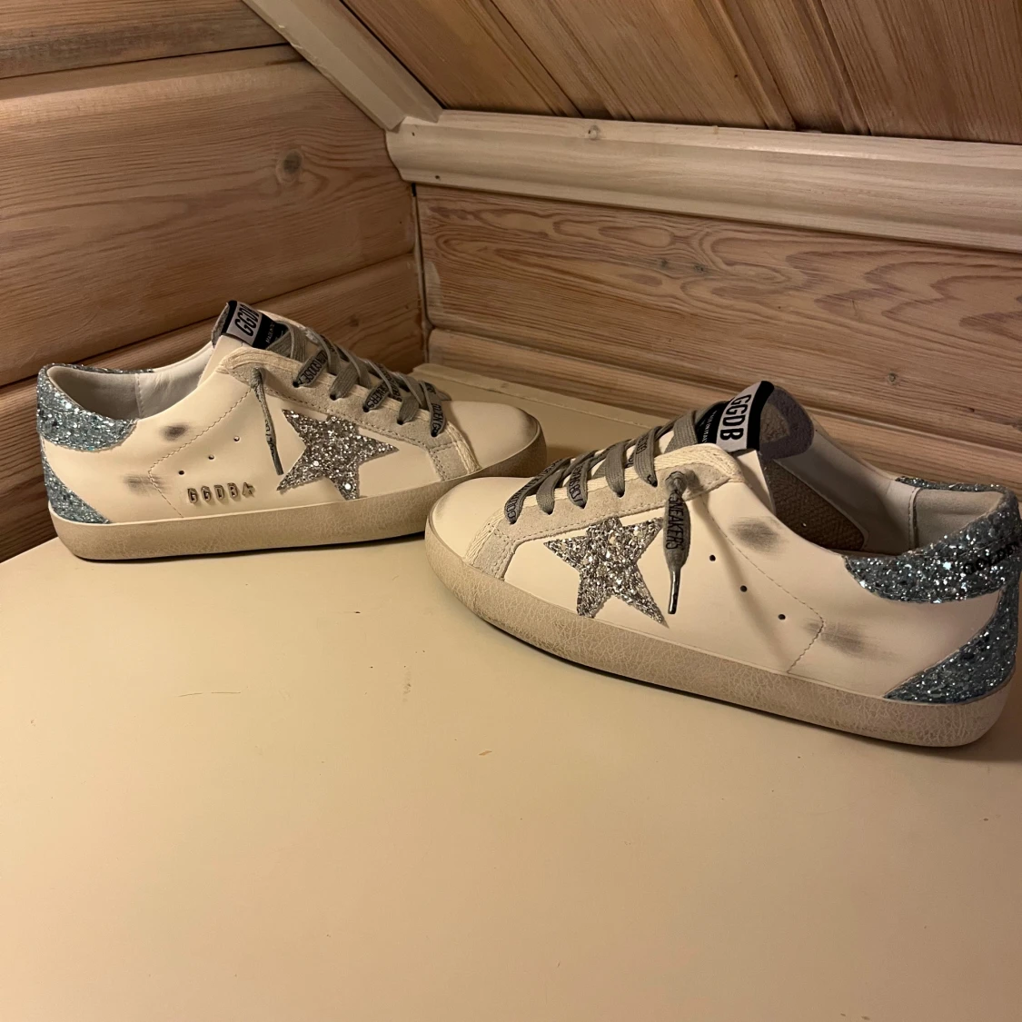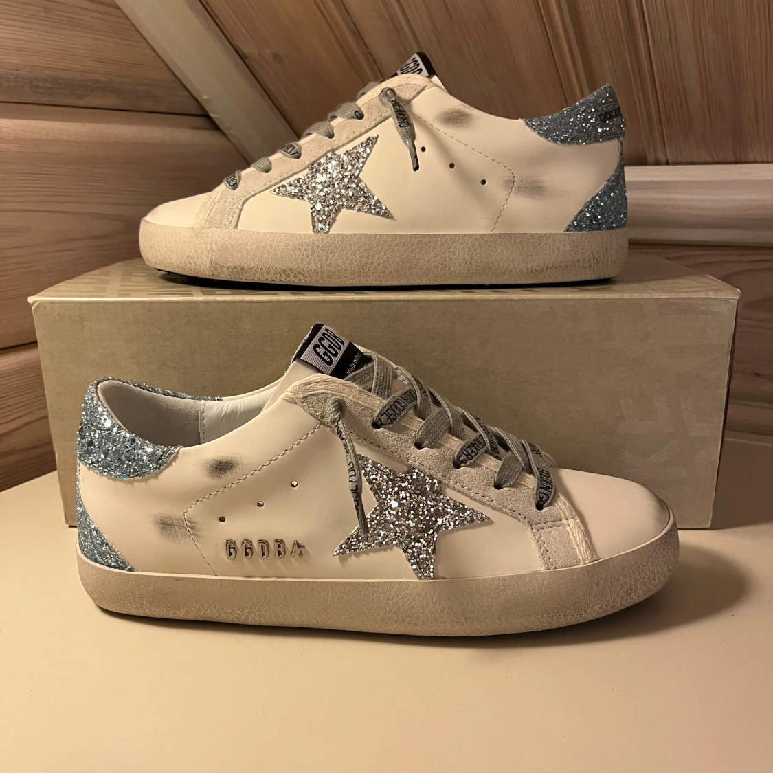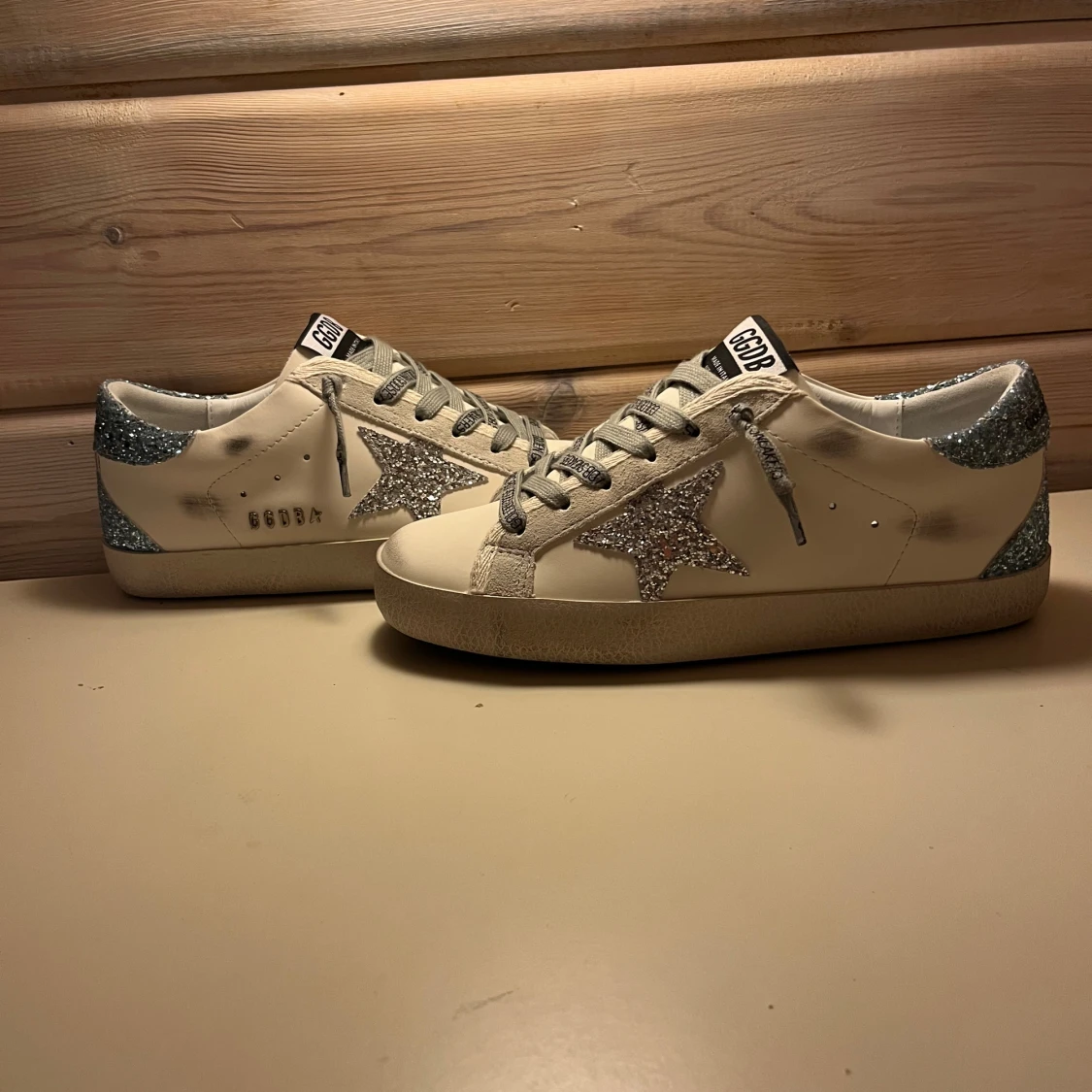 Snygga vita sneakers från Golden Goose med silverglittrig stjärna på sidan och glittrig häl. Skorna har grå snörning med tryck och en robust, något smutsad sula för en cool vintage-look. Perfekta för dig som vill sticka ut med stil.