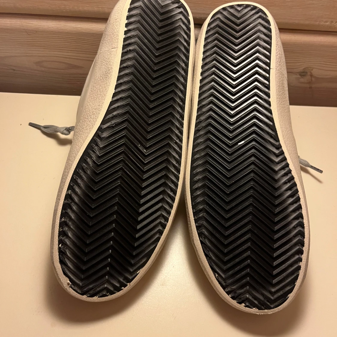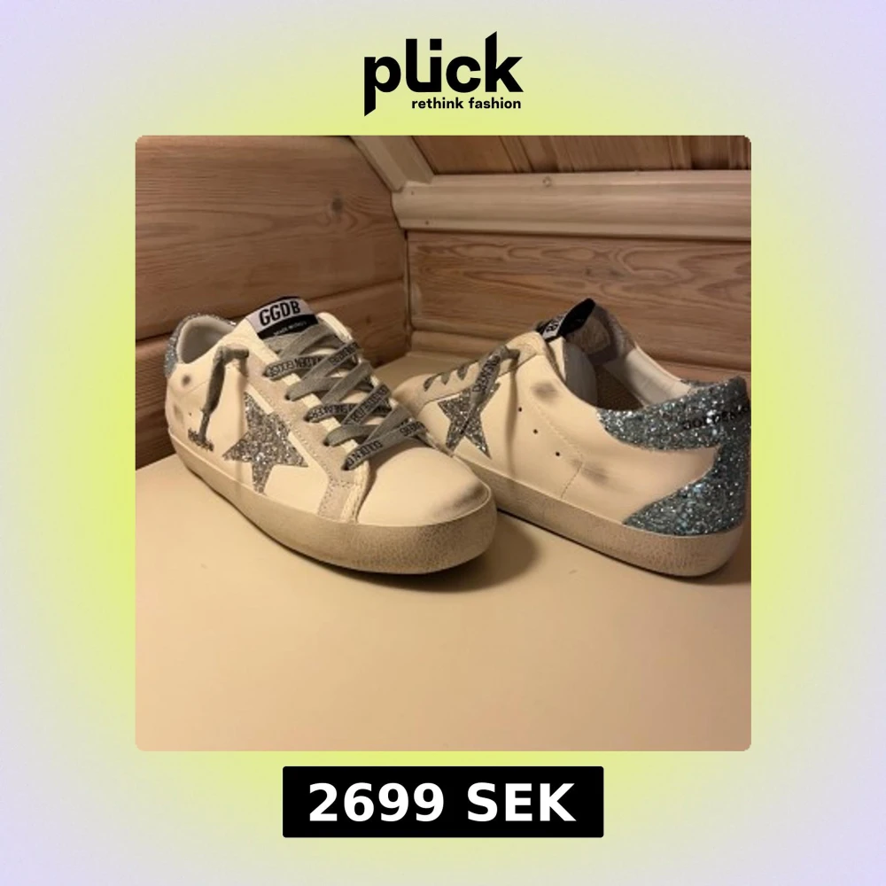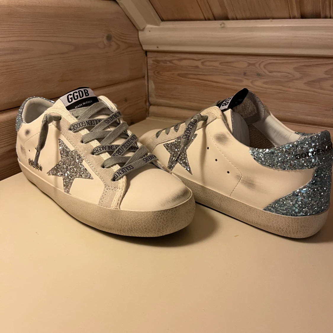 Snygga vita sneakers från Golden Goose med silverglittrig stjärna på sidan och glittrig häl. Skorna har grå snörning med tryck och en robust, något smutsad sula för en cool vintage-look. Perfekta för dig som vill sticka ut med stil.
