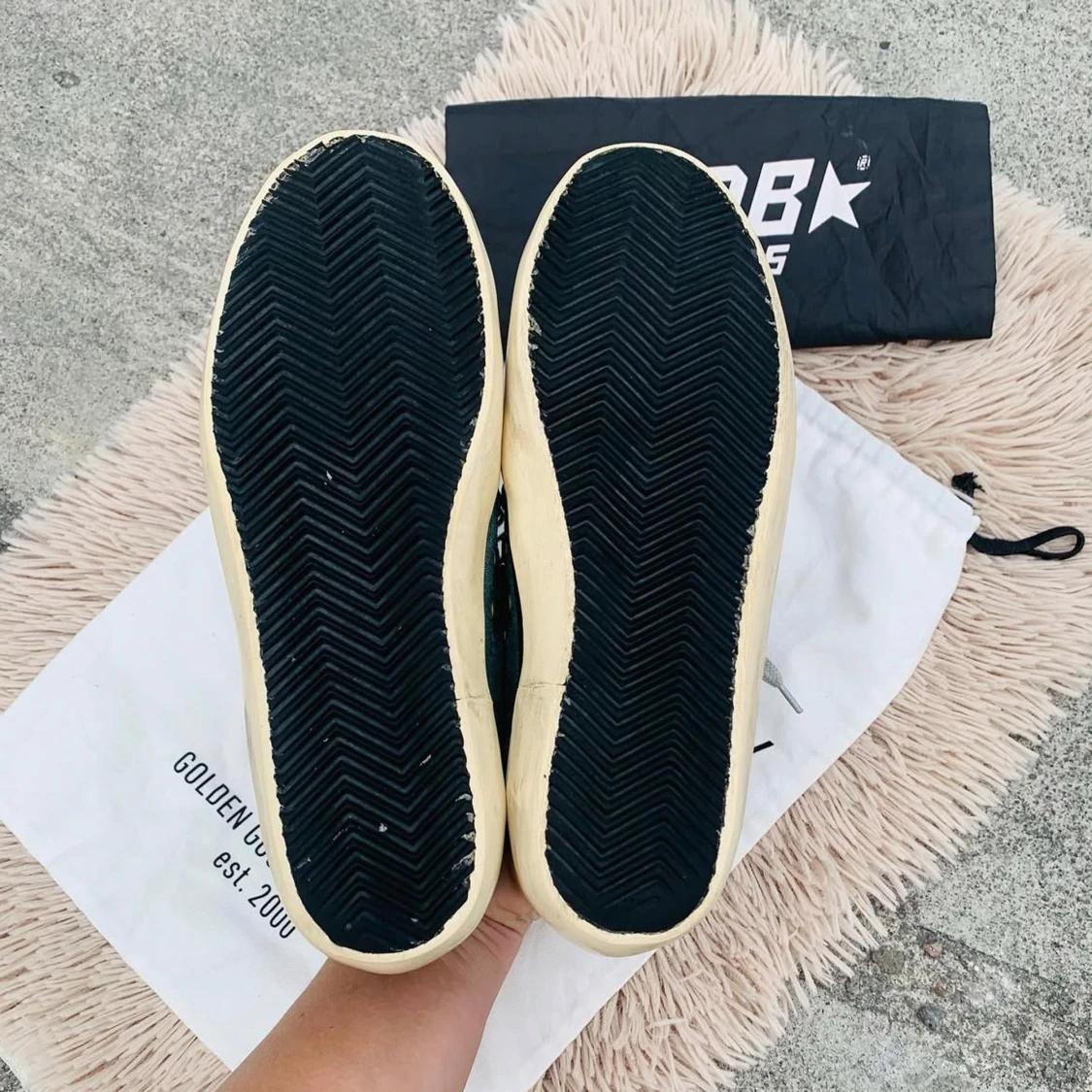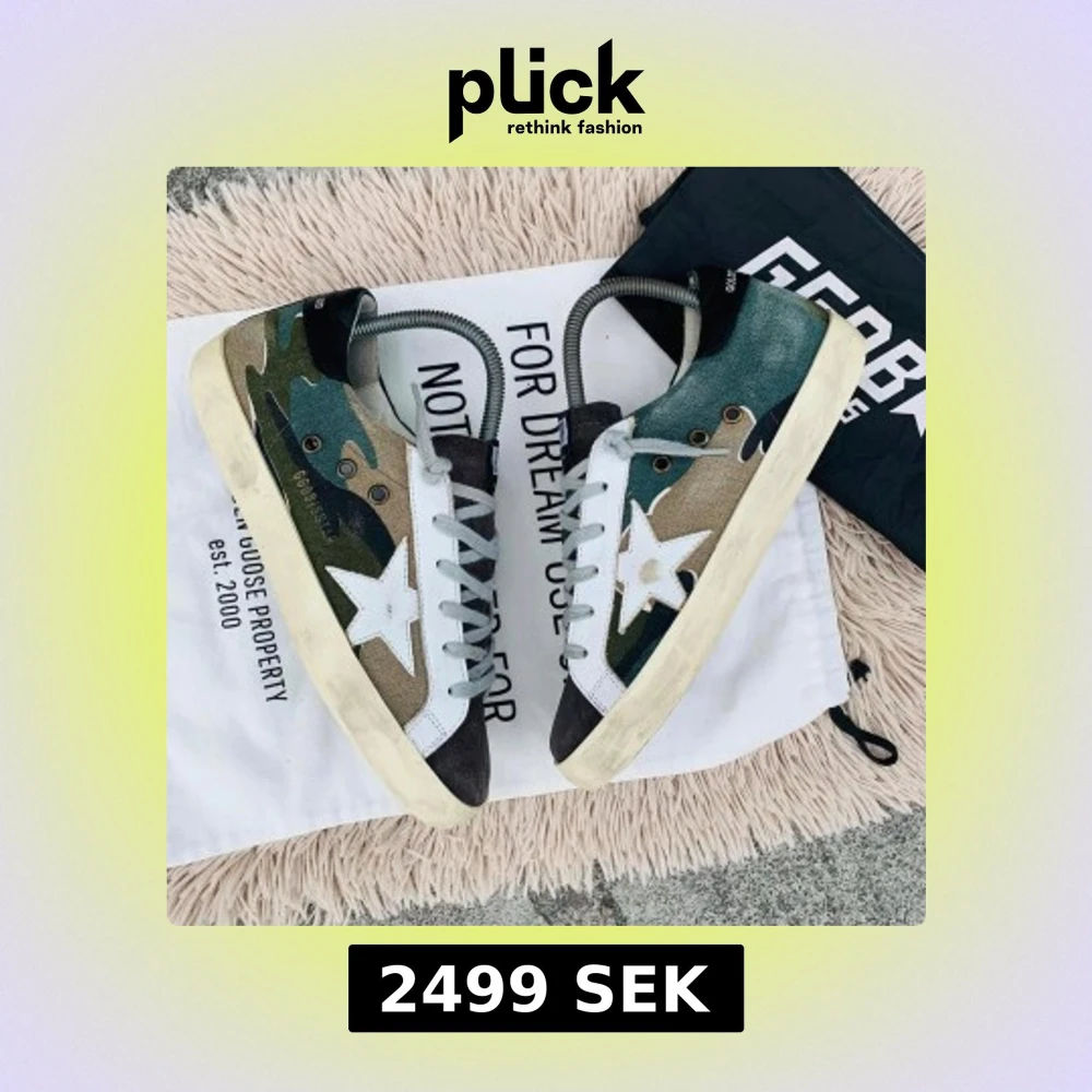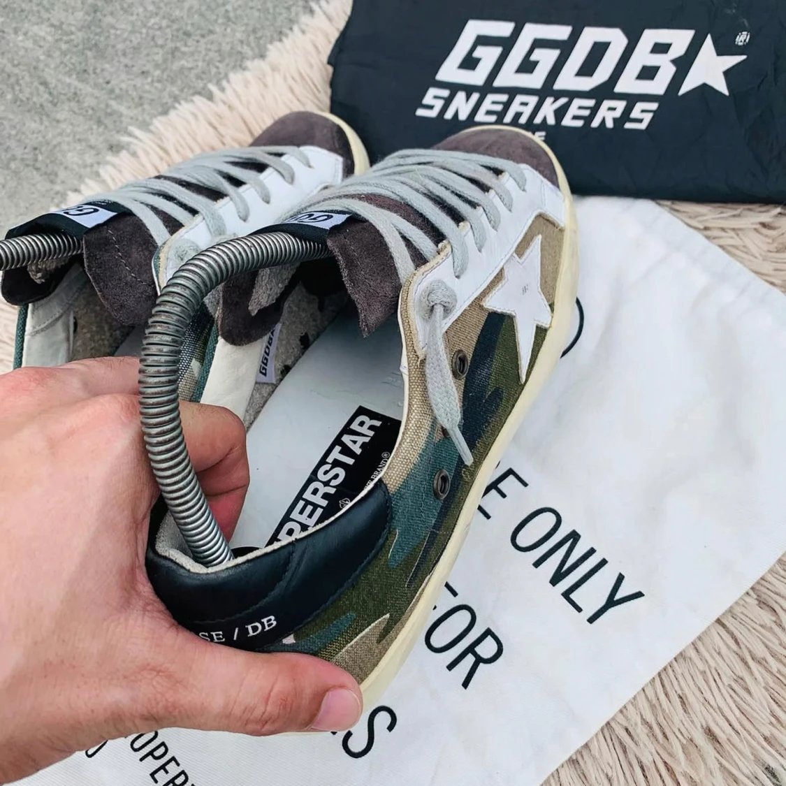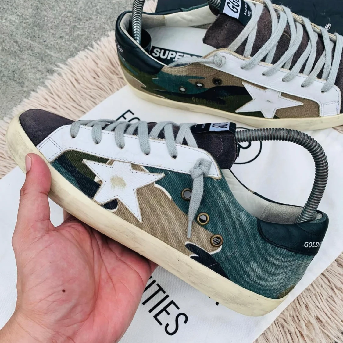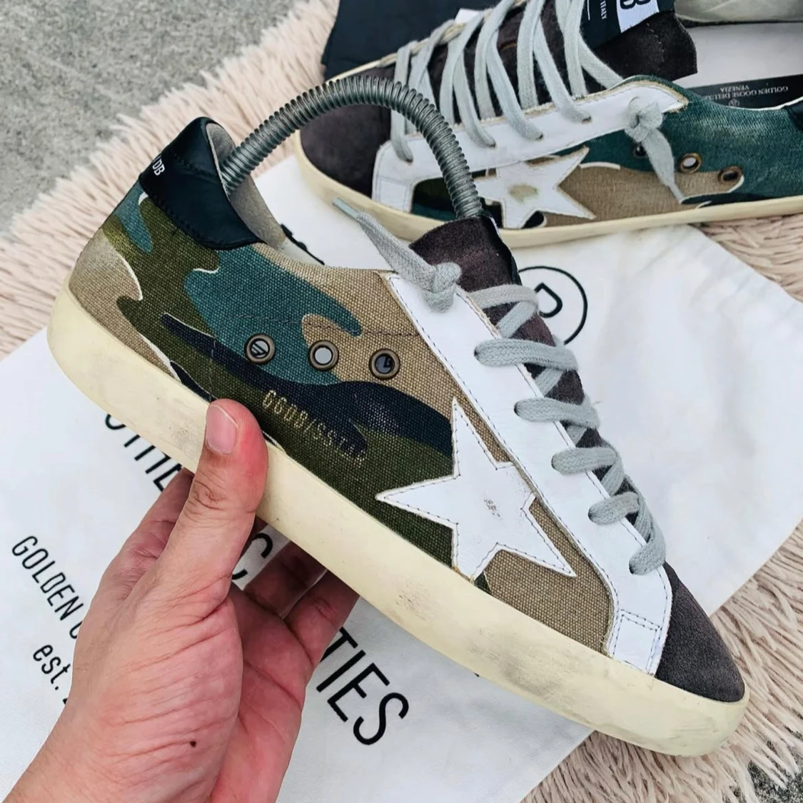 Snygga sneakers från Golden Goose med ett coolt camouflage-mönster i grönt, beige och blått. Skorna har en vit stjärna på sidan och grå snörning. Perfekta för en avslappnad stil med en touch av unik design. Storlek 39 passar 40-41.