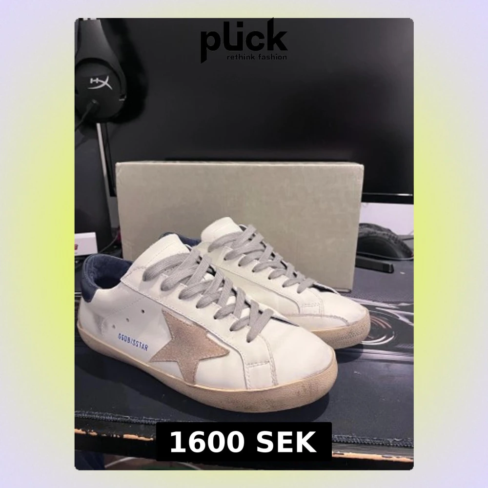 Säljer ett par GGDB Superstar sneakers i vitt skinn med grå mockastjärna på sidan och grå snörning. Skorna har mörkblå häl och beige sula med svart undersida. Klassisk rund tå och platt sula, perfekt för dig som gillar streetstyle och snygga detaljer. Om priset inte passar ge bud (seriöst)