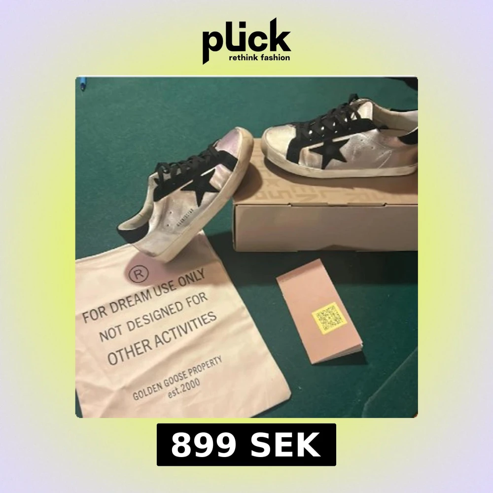 Snygga Golden Goose sneakers i metallic silver med svarta detaljer och stjärna på sidan. Skorna har svarta skosnören, vit sula och rund tå. Tillverkade i skinn och levereras med originalpåse och box. Perfekta för dig som vill sticka ut med en cool streetstyle.