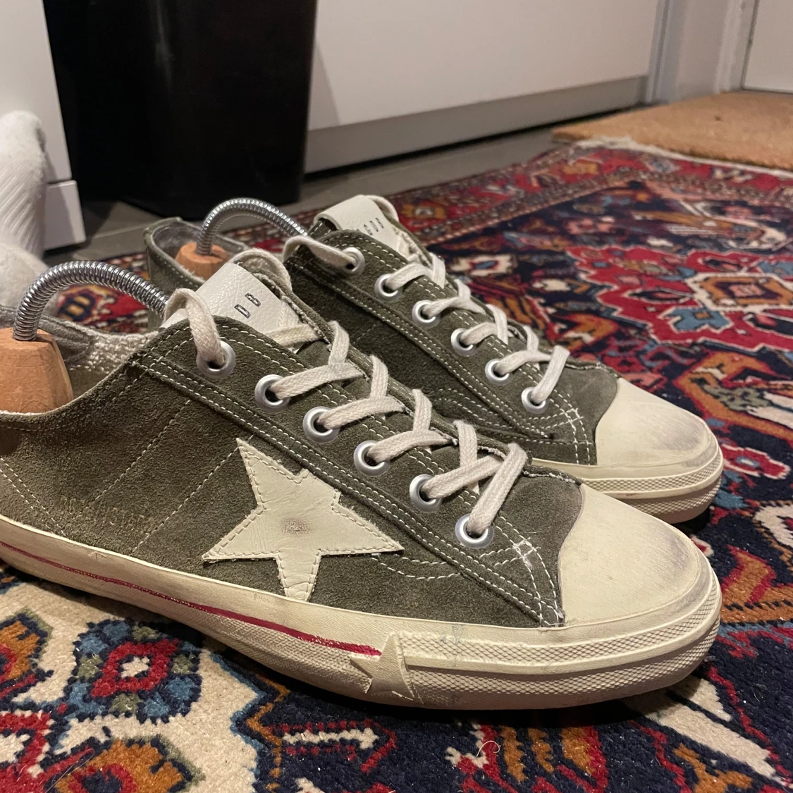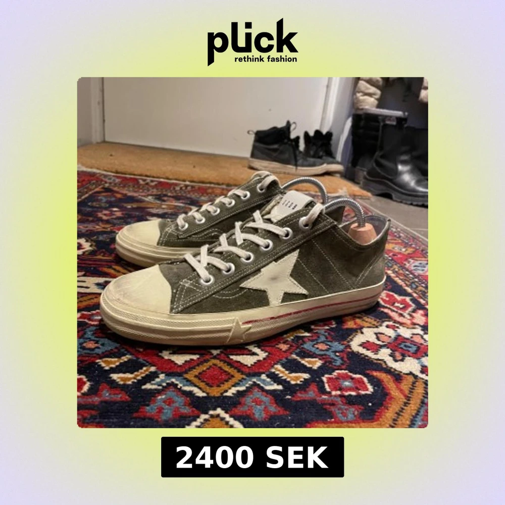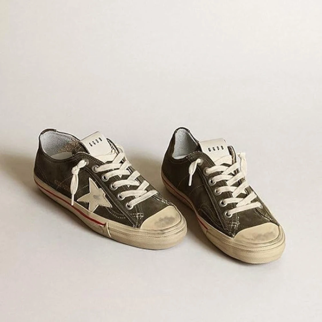Snygga olivgröna sneakers från Golden Goose med en vit stjärna på sidan. Skorna har en klassisk snörning och en vit sula med en lätt sliten look för en vintagekänsla. Perfekta för en avslappnad stil.