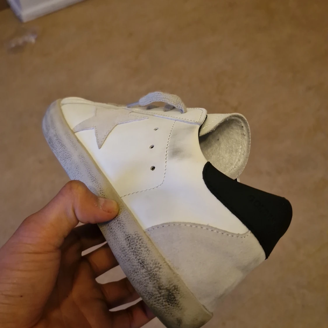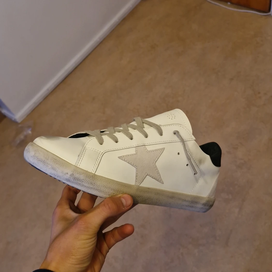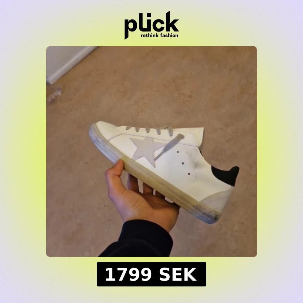 Säljer ett par vita sneakers från Golden Goose med grå stjärna på sidan, grå snörning och svart hälparti. Skorna har en klassisk låg profil och platt sula. Perfekta för dig som gillar en stilren men ändå unik look.