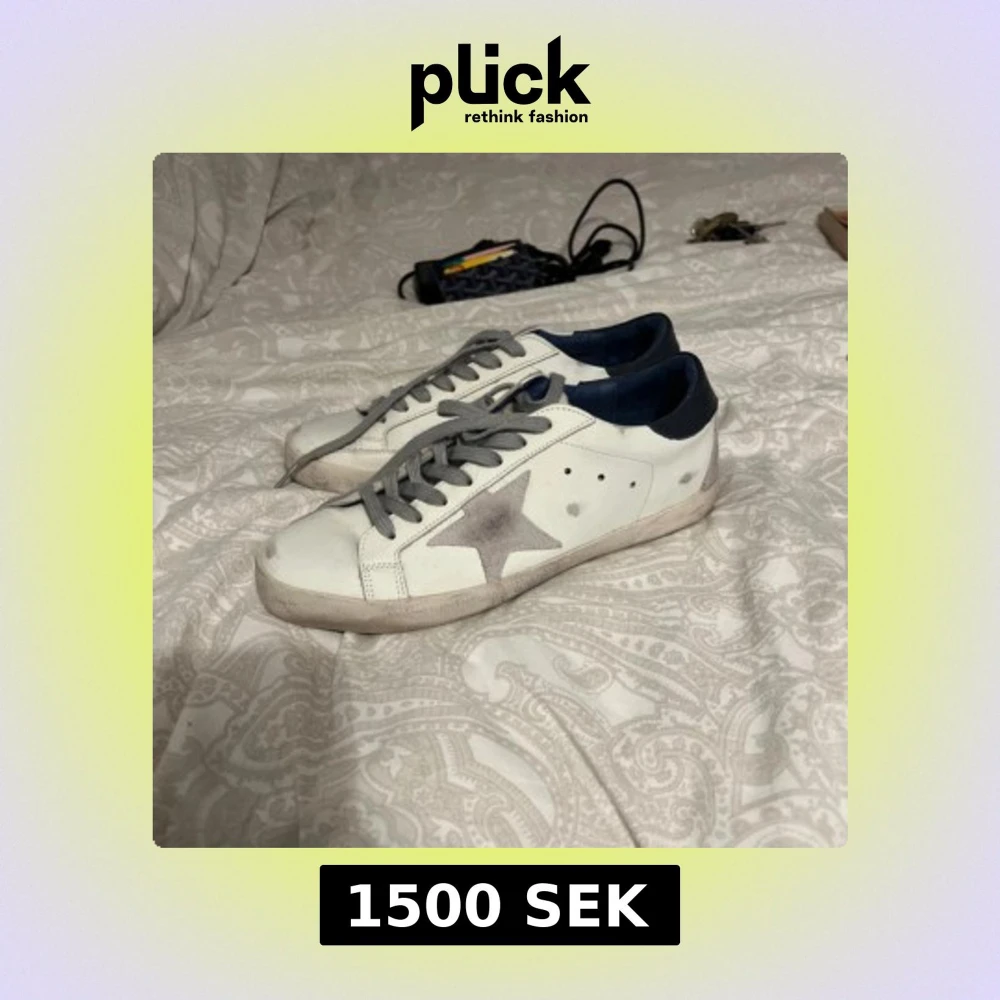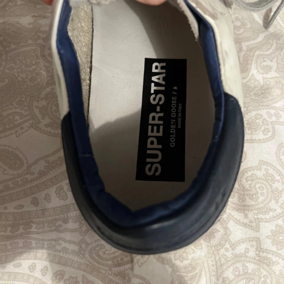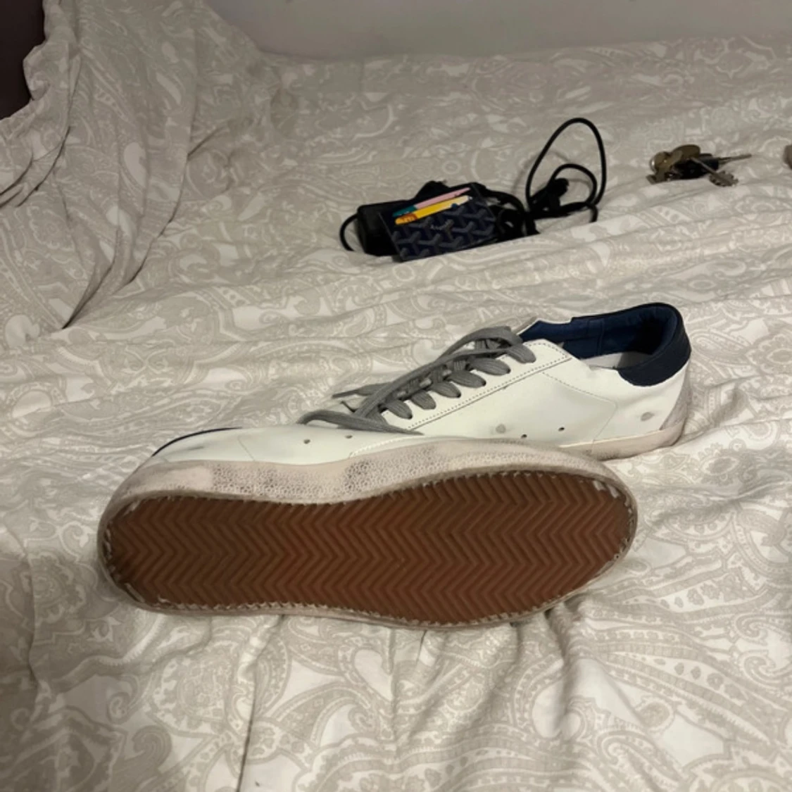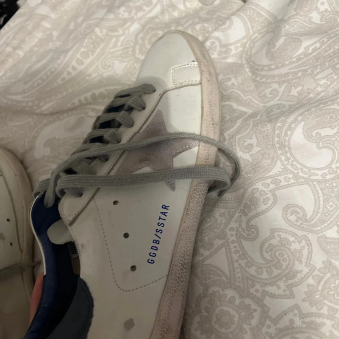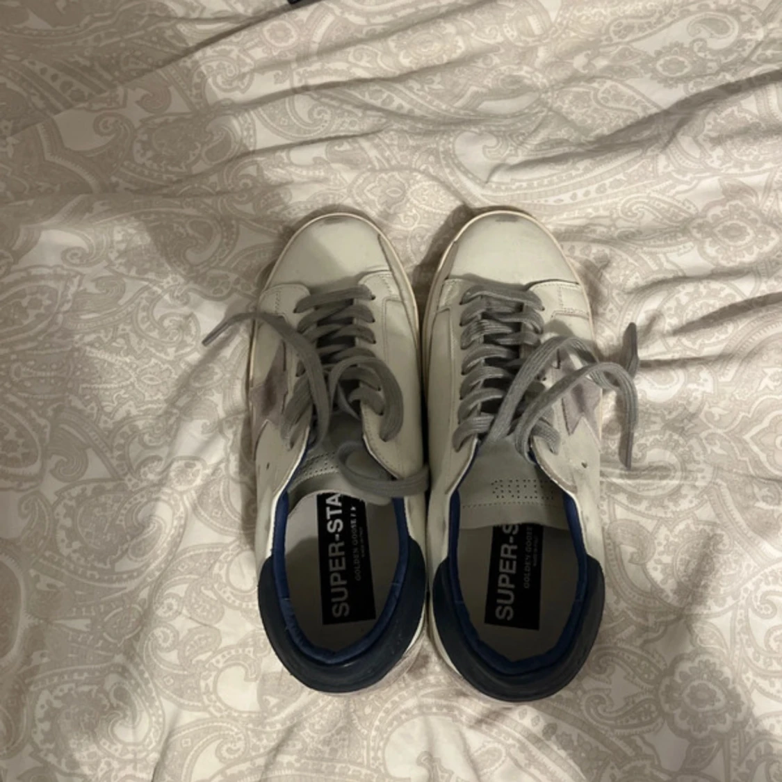 Golden Goose Superstar sneakers i vitt skinn med grå stjärndetalj på sidan, grå snörning och mörkblå häl. Klassisk låg modell med platt sula och rund tå. Snyggt slitna detaljer för en cool, avslappnad vibe.