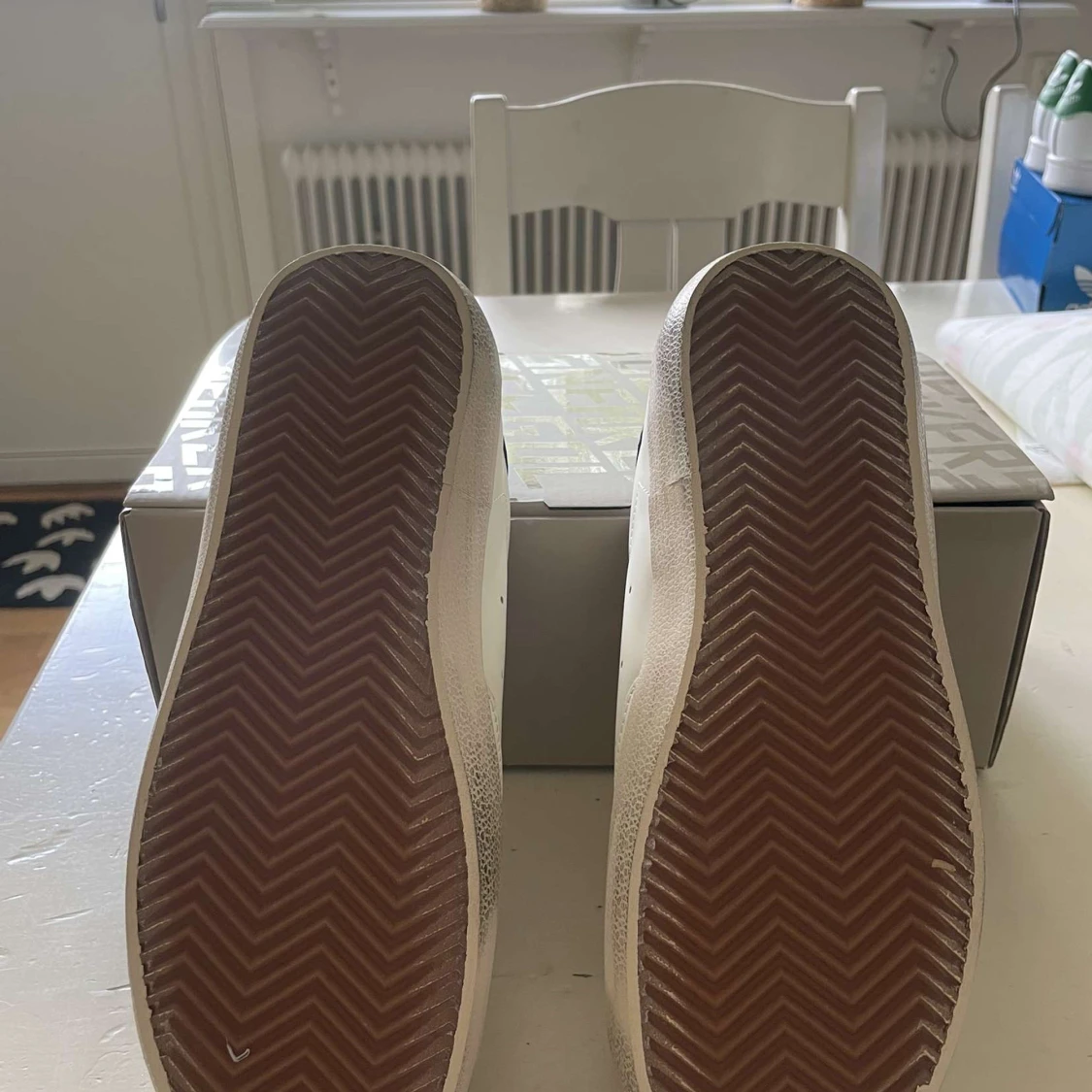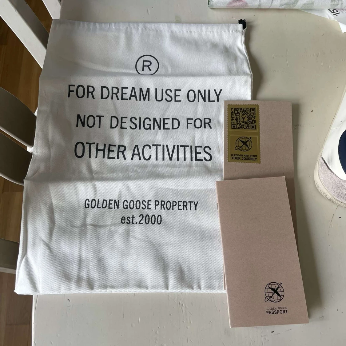 Golden Goose Superstar sneakers i vitt skinn med grå stjärndetalj på sidan, grå snörning och mörkblå häl. Snyggt slitna detaljer och platt sula ger en cool, avslappnad vibe. Kommer med originalpåse och pass. Perfekta för dig som gillar streetstyle.