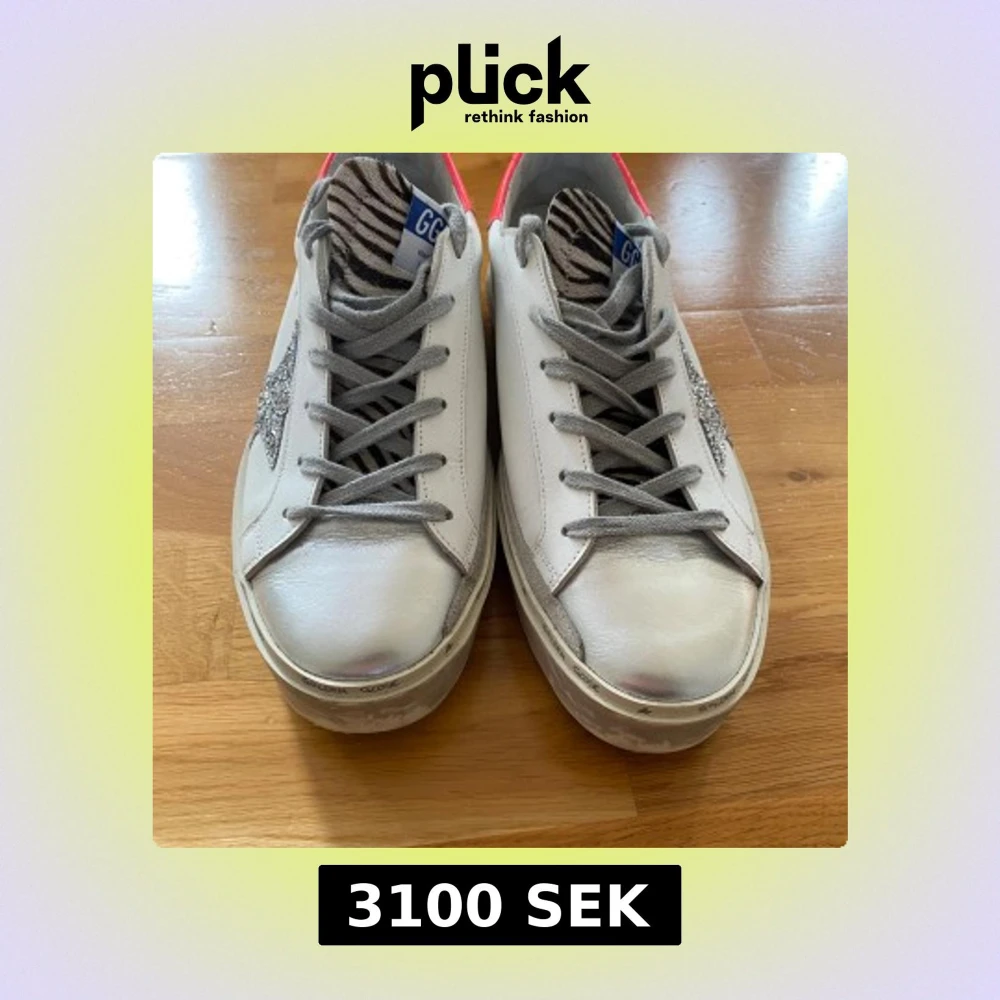Golden Goose Hi Star sneakers i vitt skinn med grå snörning, silverfärgad tå och glittrig stjärndetalj på sidan. Hälpartiet är i stark rosa och plösen har zebramönster. Sulan är platt och har märkets logga runtom. Snygg limited edition-modell med coola detaljer. Kartong och dustbag medföljer.