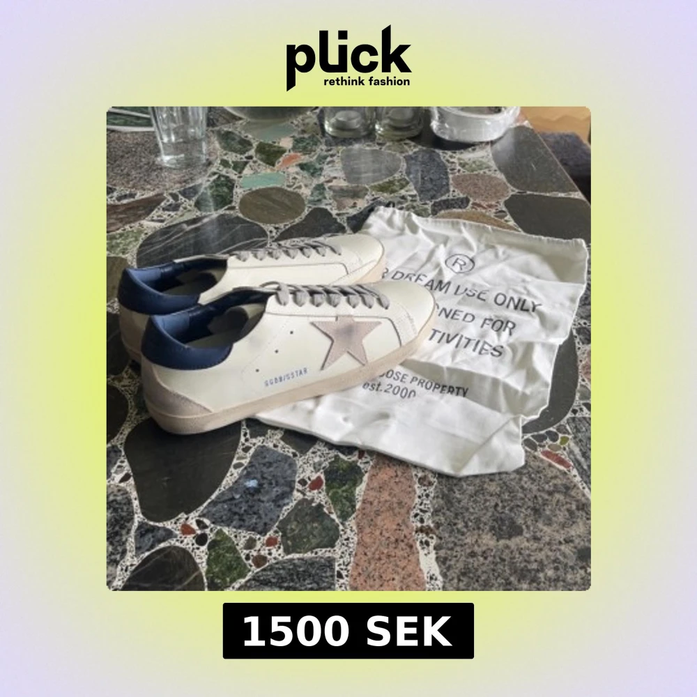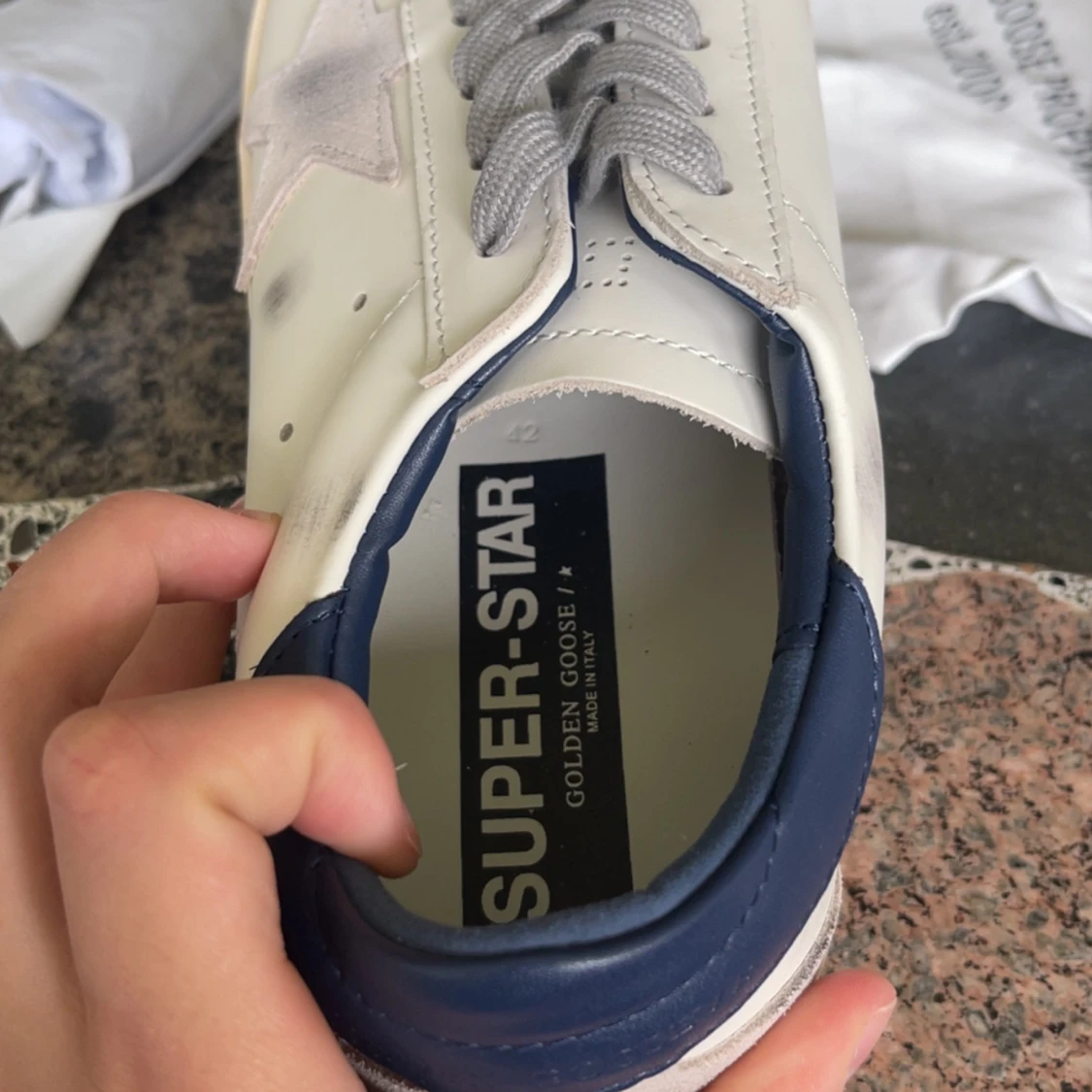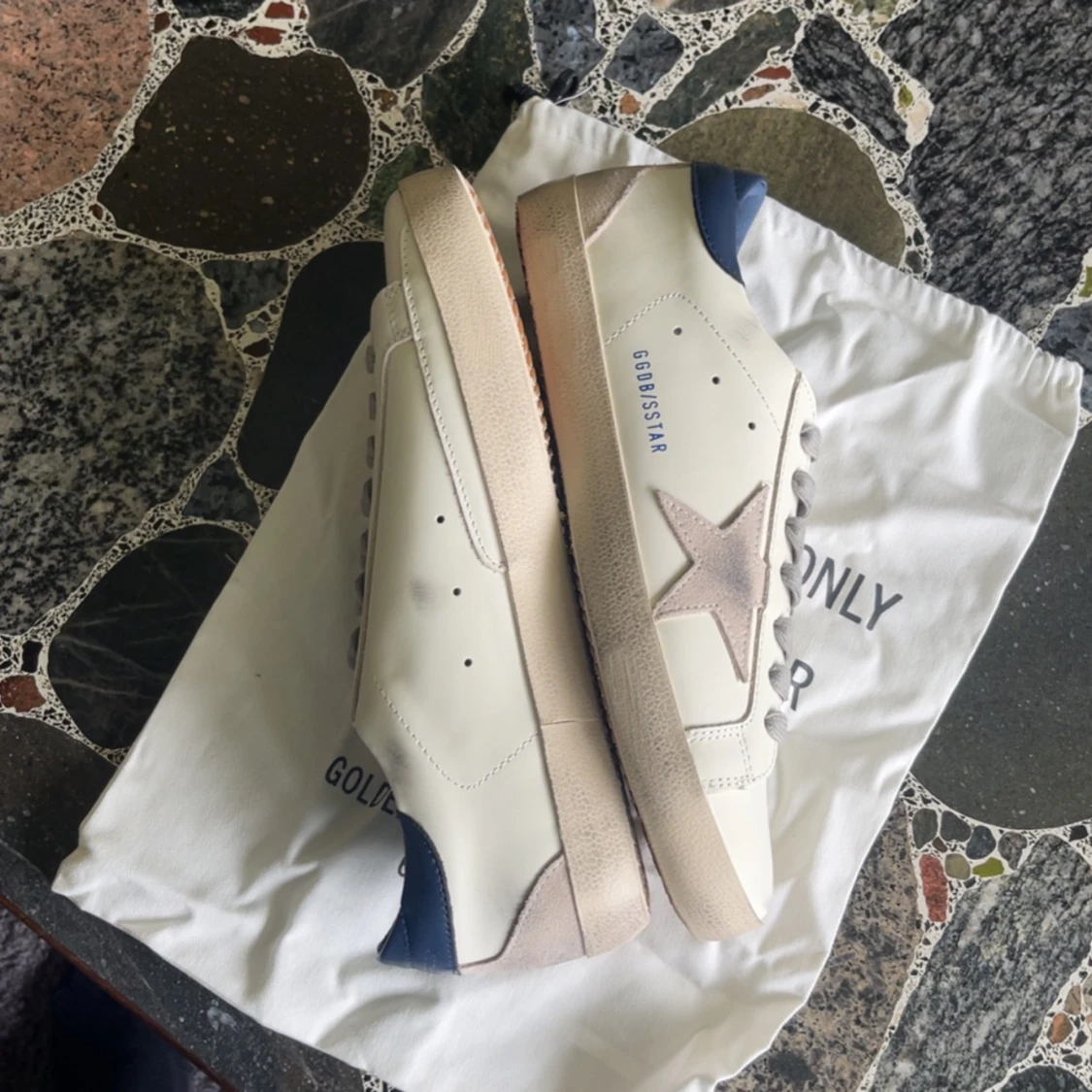 Golden Goose sneakers i vitt skinn med grå mockadetaljer och en ikonisk stjärna på sidan. Blå hälkappa i skinn, grå snörning och beige sula. Snygg och stilren modell som passar perfekt till jeans eller kjol. Kommer utan Skokartong