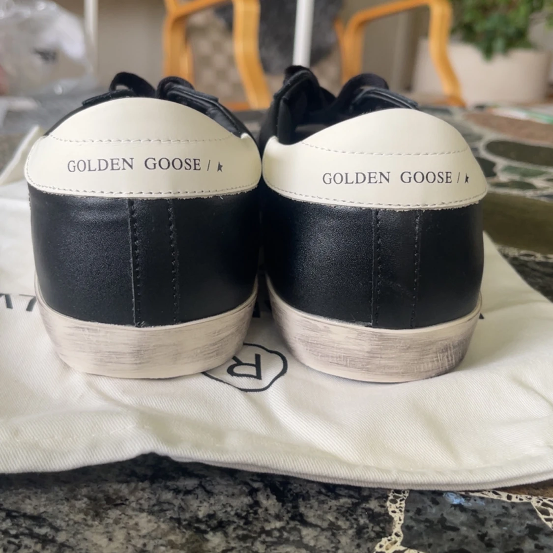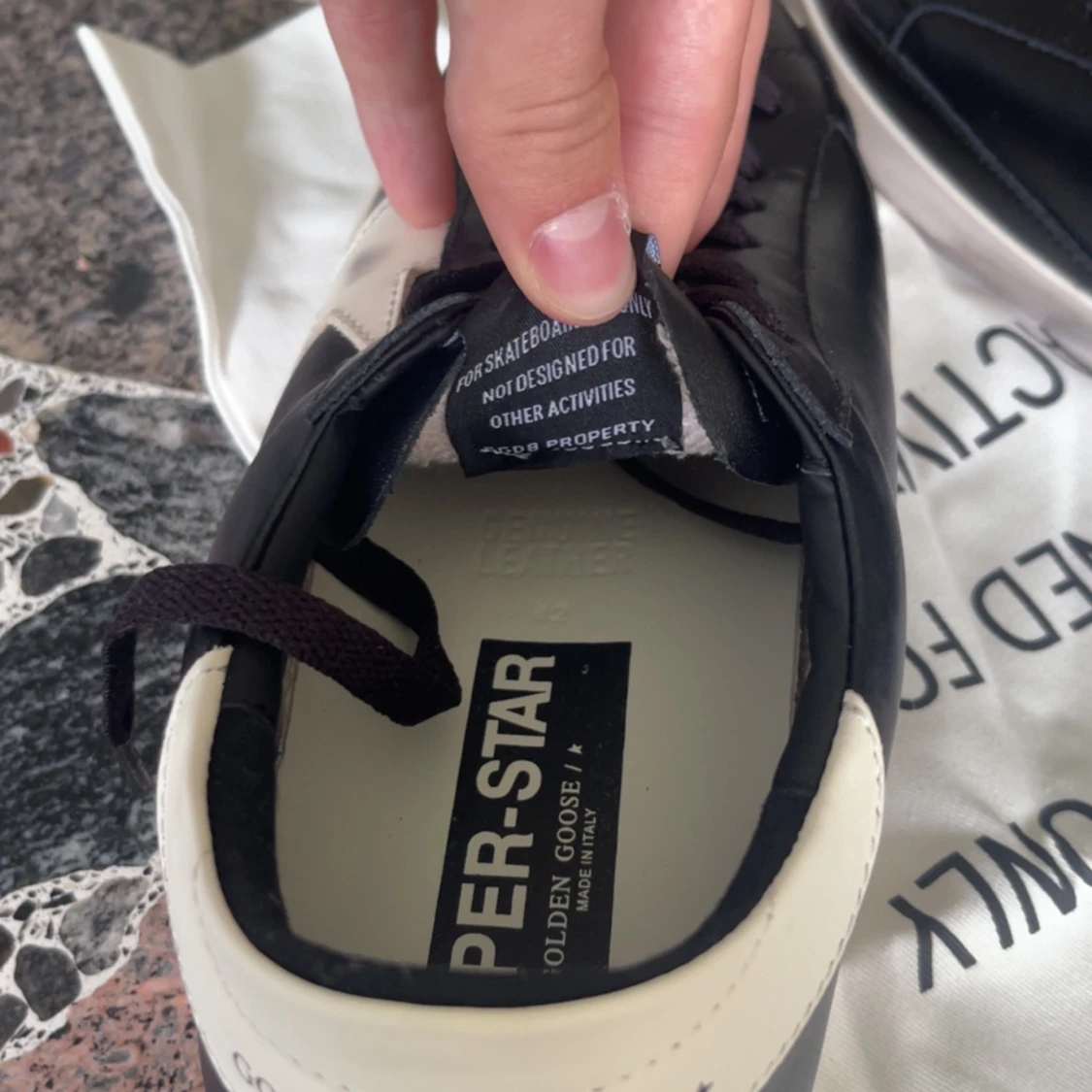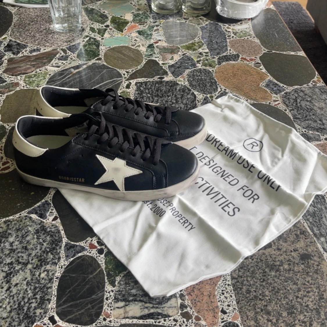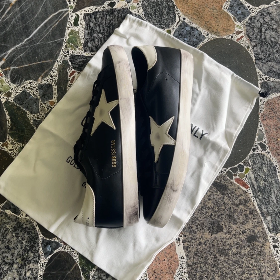 Golden Goose sneakers i svart skinn med vit stjärndetalj på sidan och vit häl med logotyp. Skorna har svarta snören och en vit, något smutsad sula för en cool, använd look. Klassisk rund tå och låg modell. Perfekta för dig som gillar streetstyle. Kommer utan Skokartong