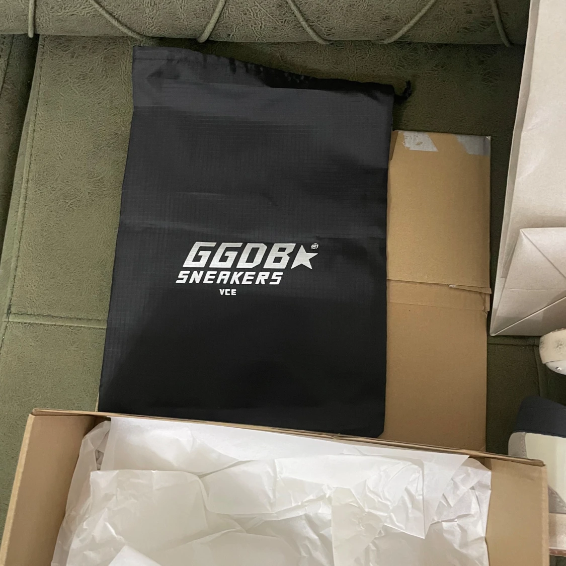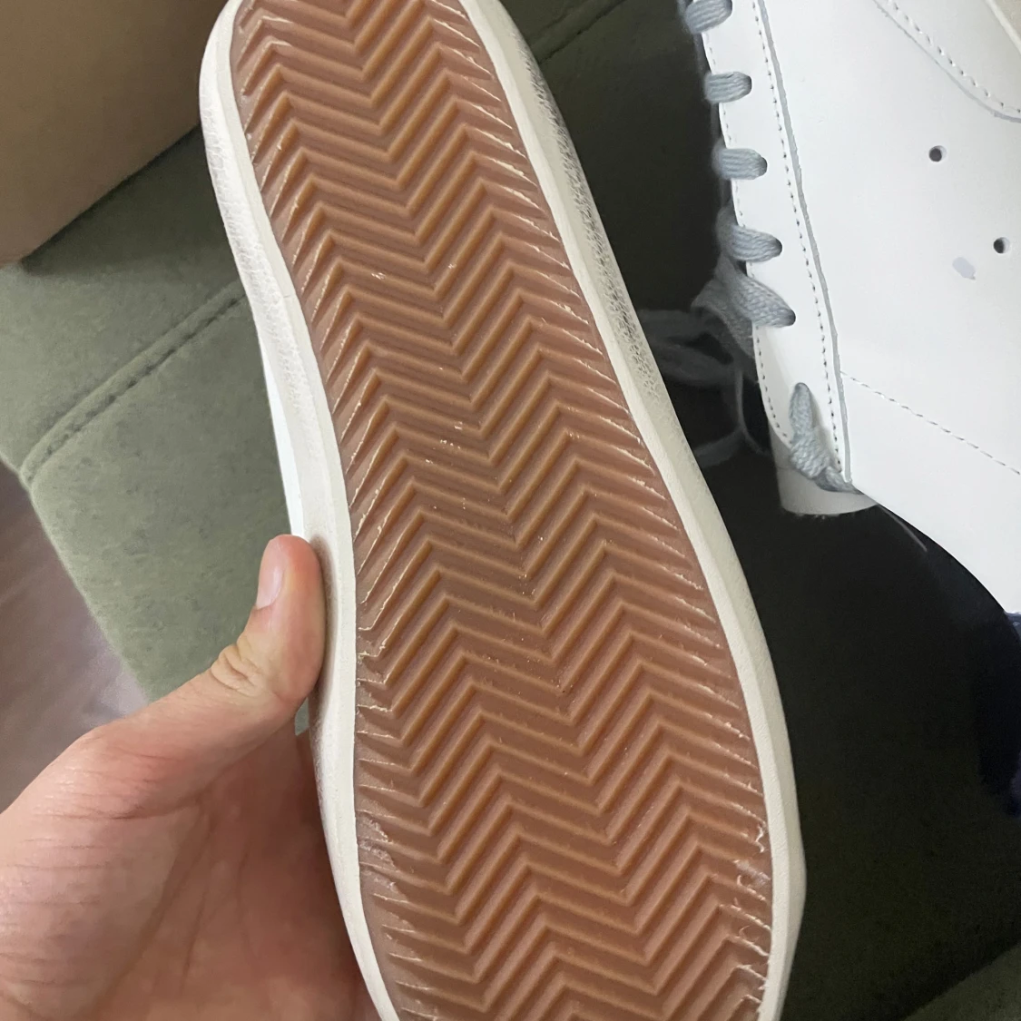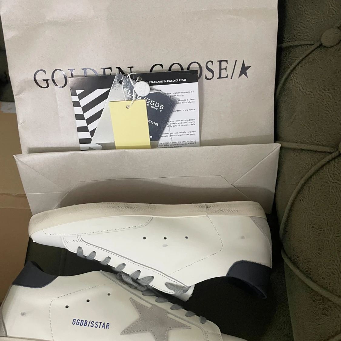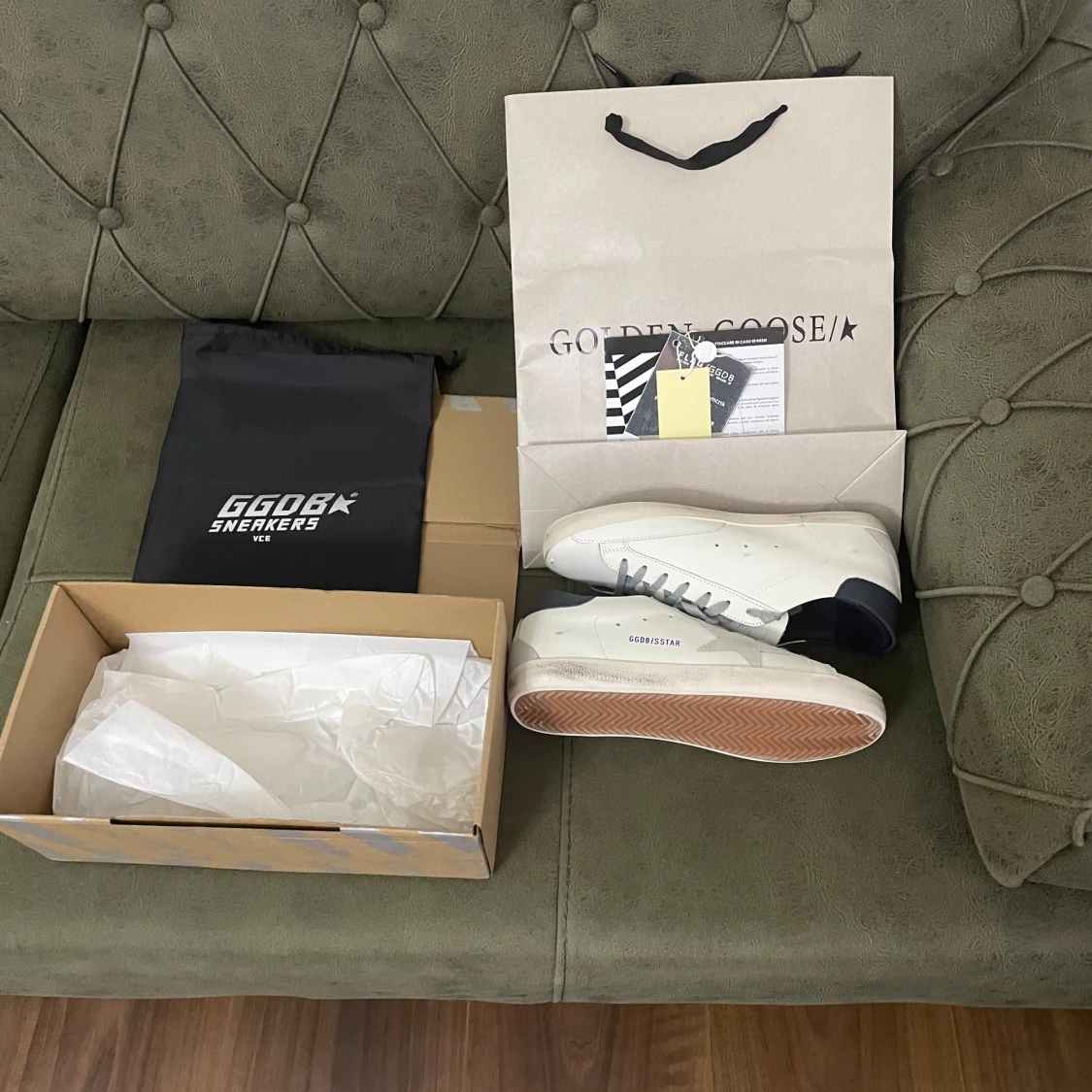 Snygga vita sneakers från Golden Goose med svarta detaljer och en stjärna på sidan. Skorna har en klassisk snörning och en gummisula med fiskbensmönster. Perfekta för en stilren look. Skorna är helt äkta för bara 2199