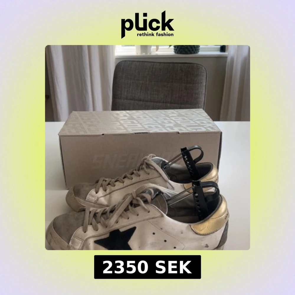 Säljer ett par vita Golden Goose sneakers med svart stjärna på sidan och gulddetaljer på hälen. Skorna har beige snörning och texten 'GOLDEN GOOSE' på sidan. Klassisk rund tå och platt sula. Kan behöva en liten tvätt men annars är smutsen en dal av modellen. Kom med bud och frågor!