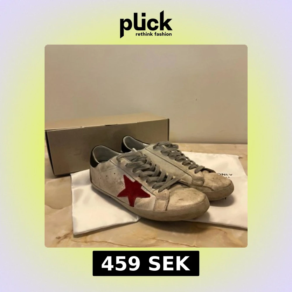 Snygga vita Golden goose skor med röd stjärna på sidan. Skorna har grå snörning och en svart häl. De är ganska använda och därav priset. Vid fler frågor eller bilder, kontakta.