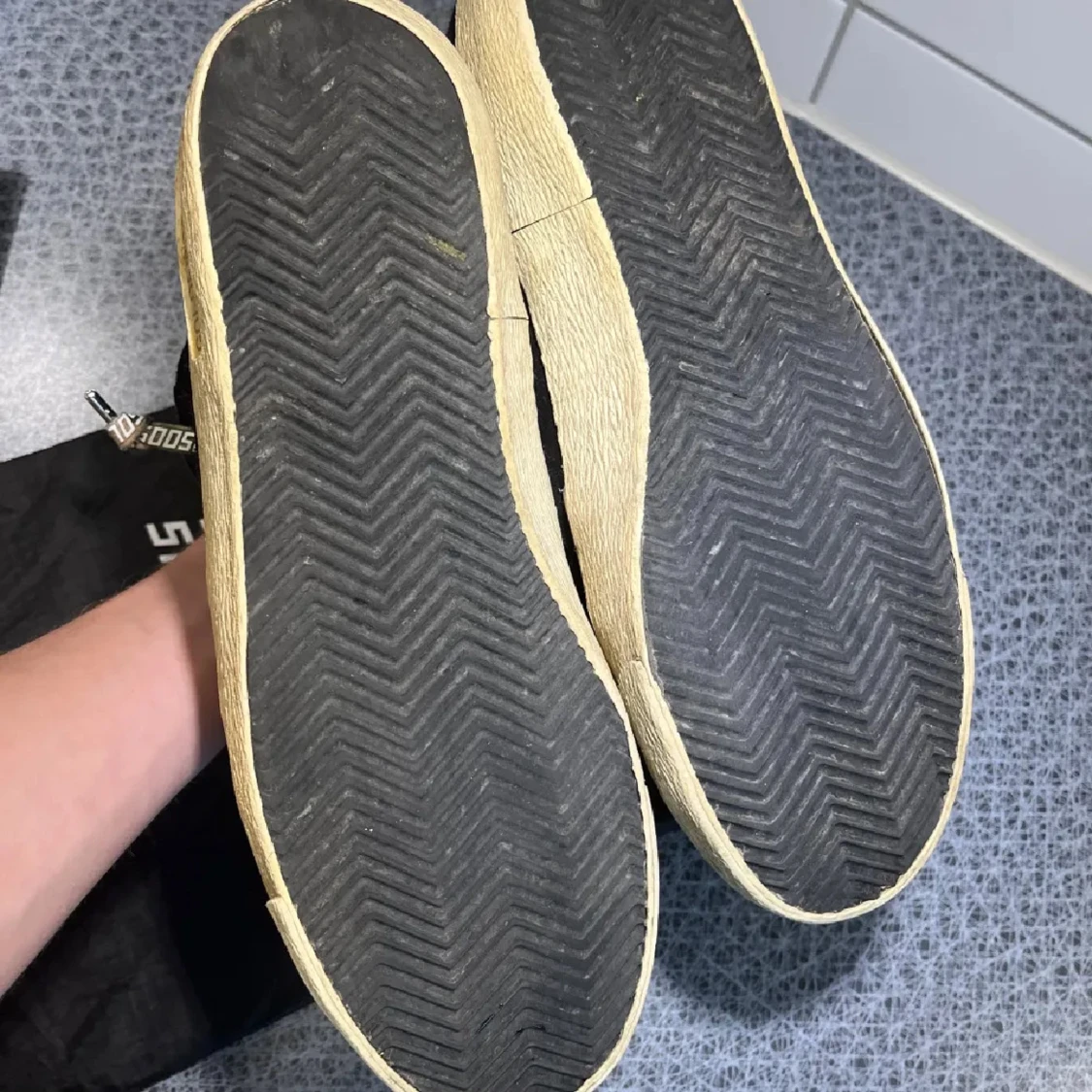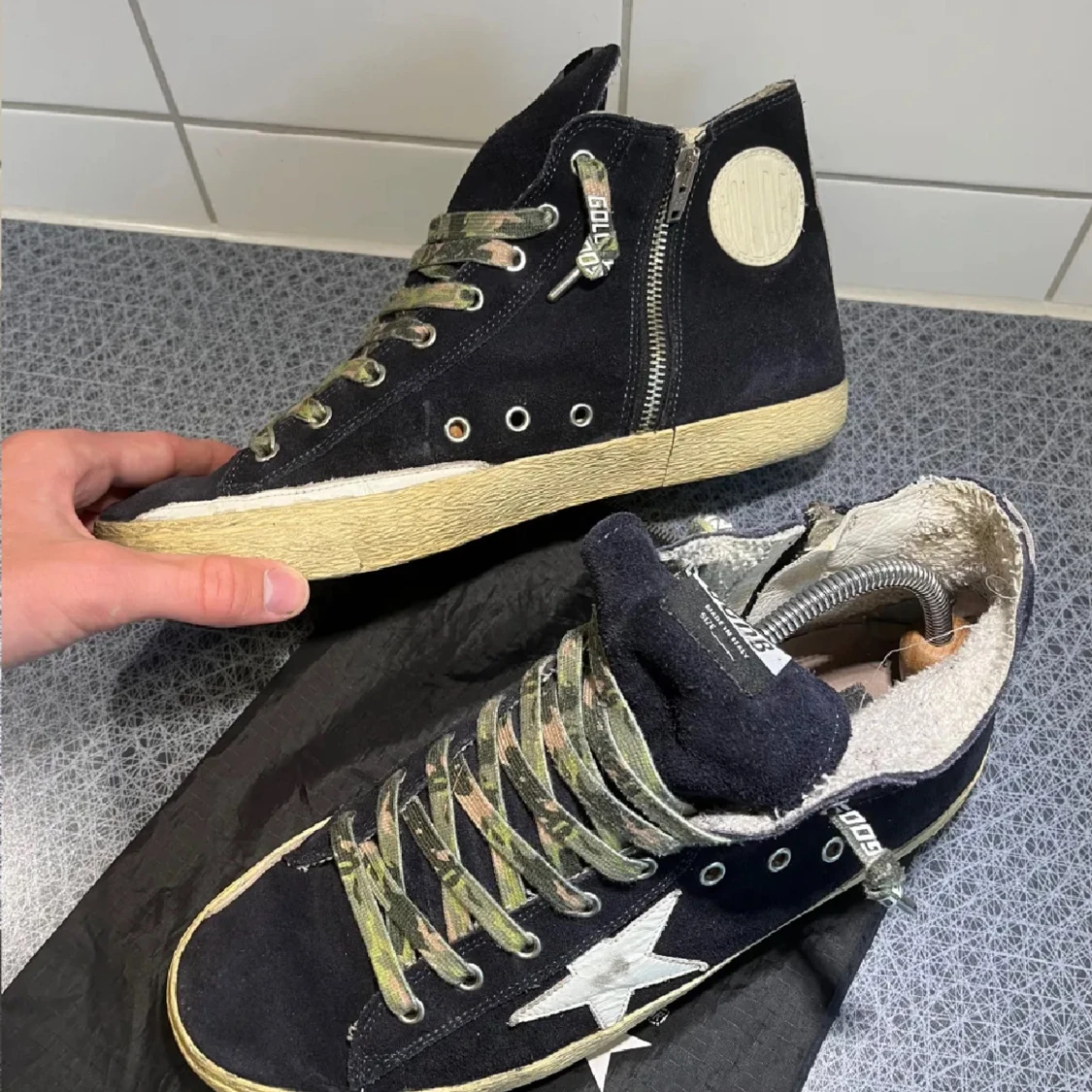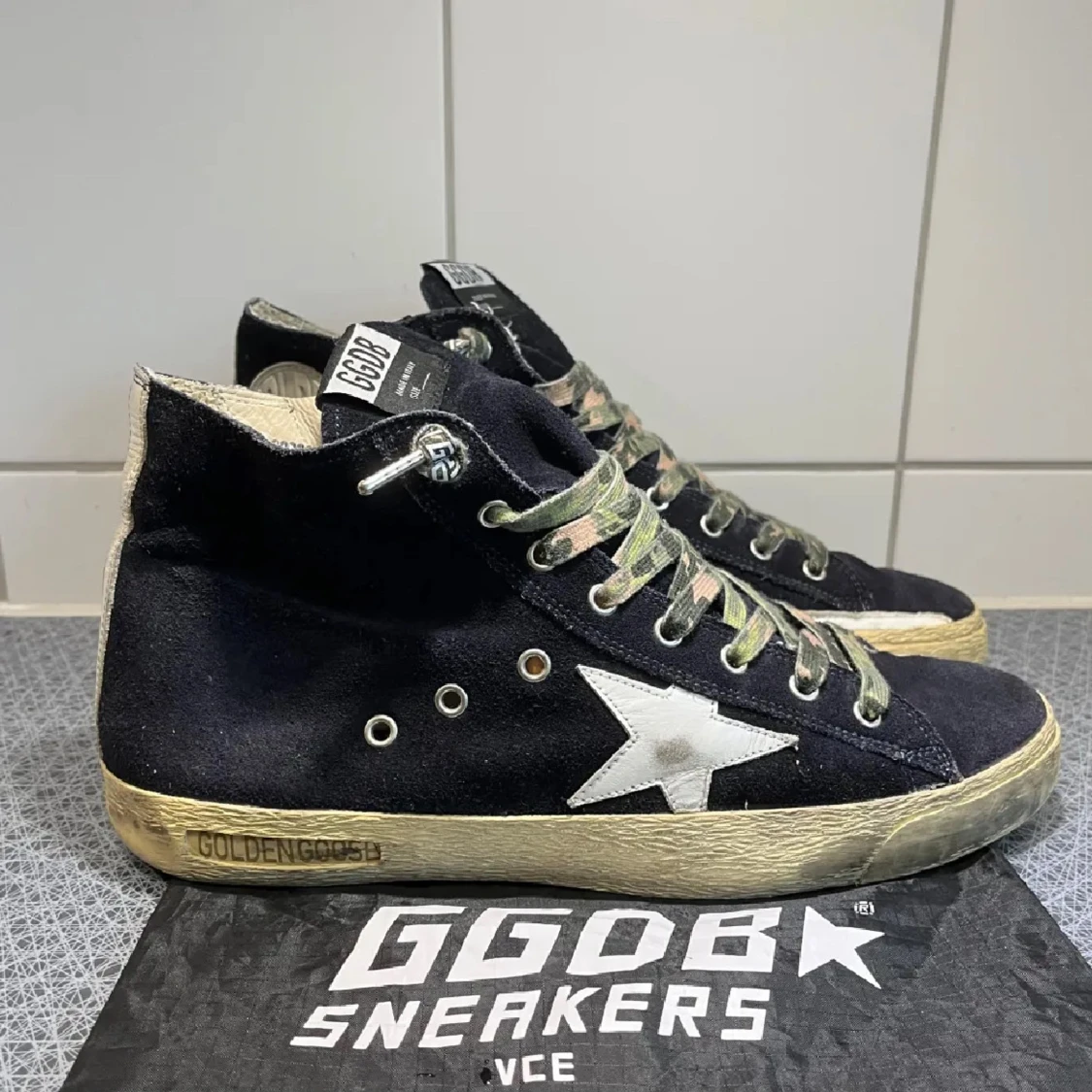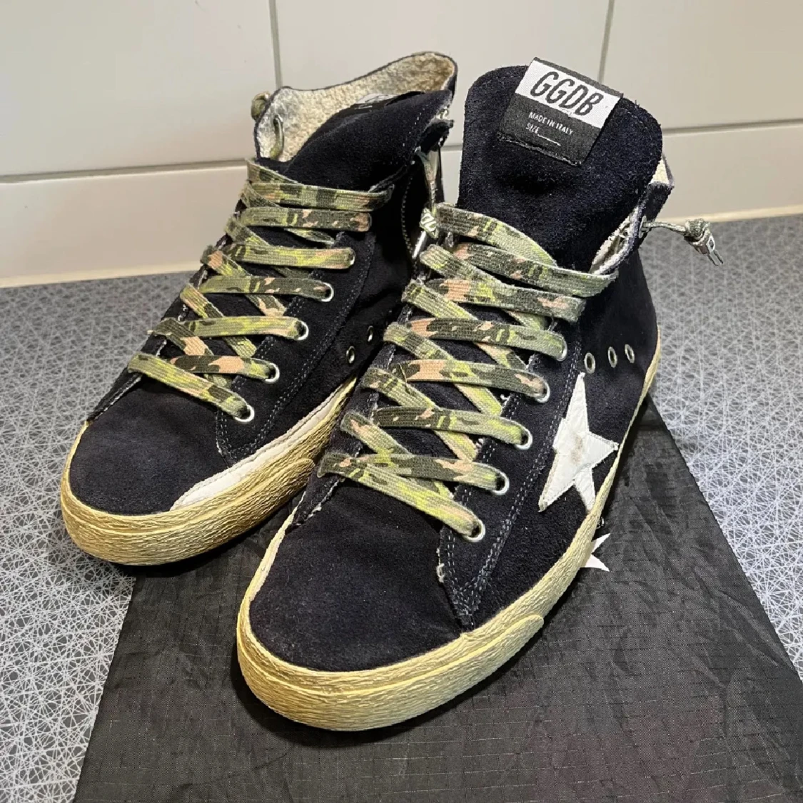 Snygga svarta sneakers från Golden Goose med vit stjärndetalj på sidan. Skorna har en unik design med kamouflagemönstrade snören och dragkedja på sidan för enkel påtagning. Sulan har en vintage-look som ger en cool stil. Skriv för frågor. Pris kan diskuteras