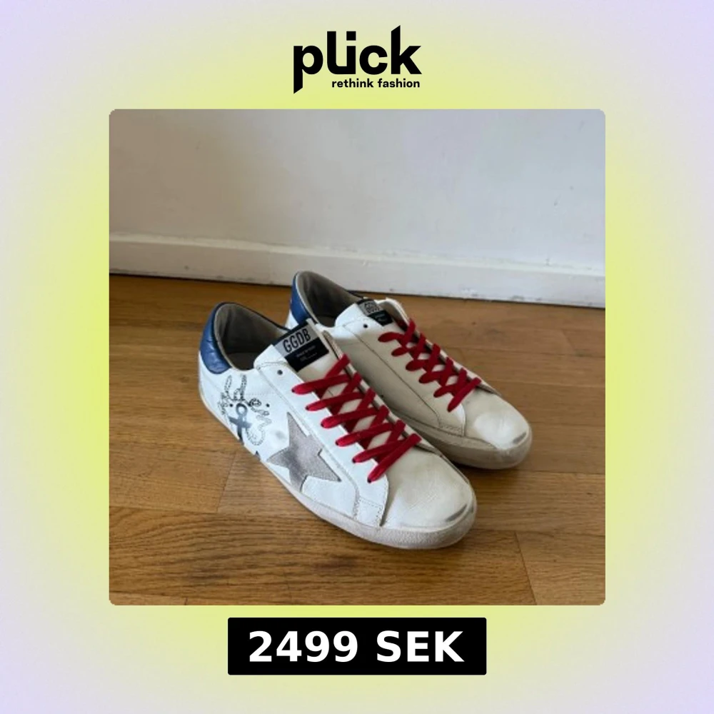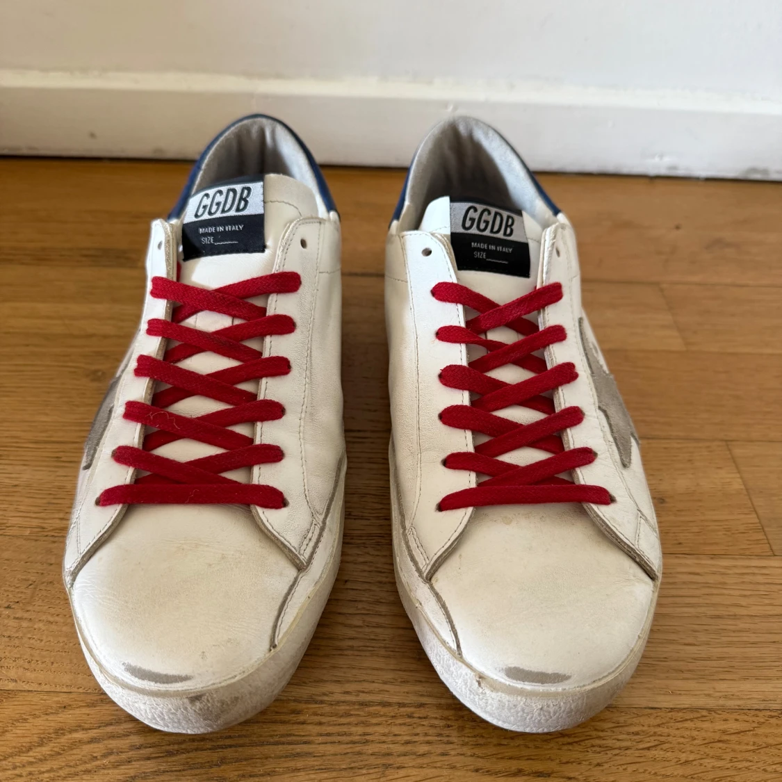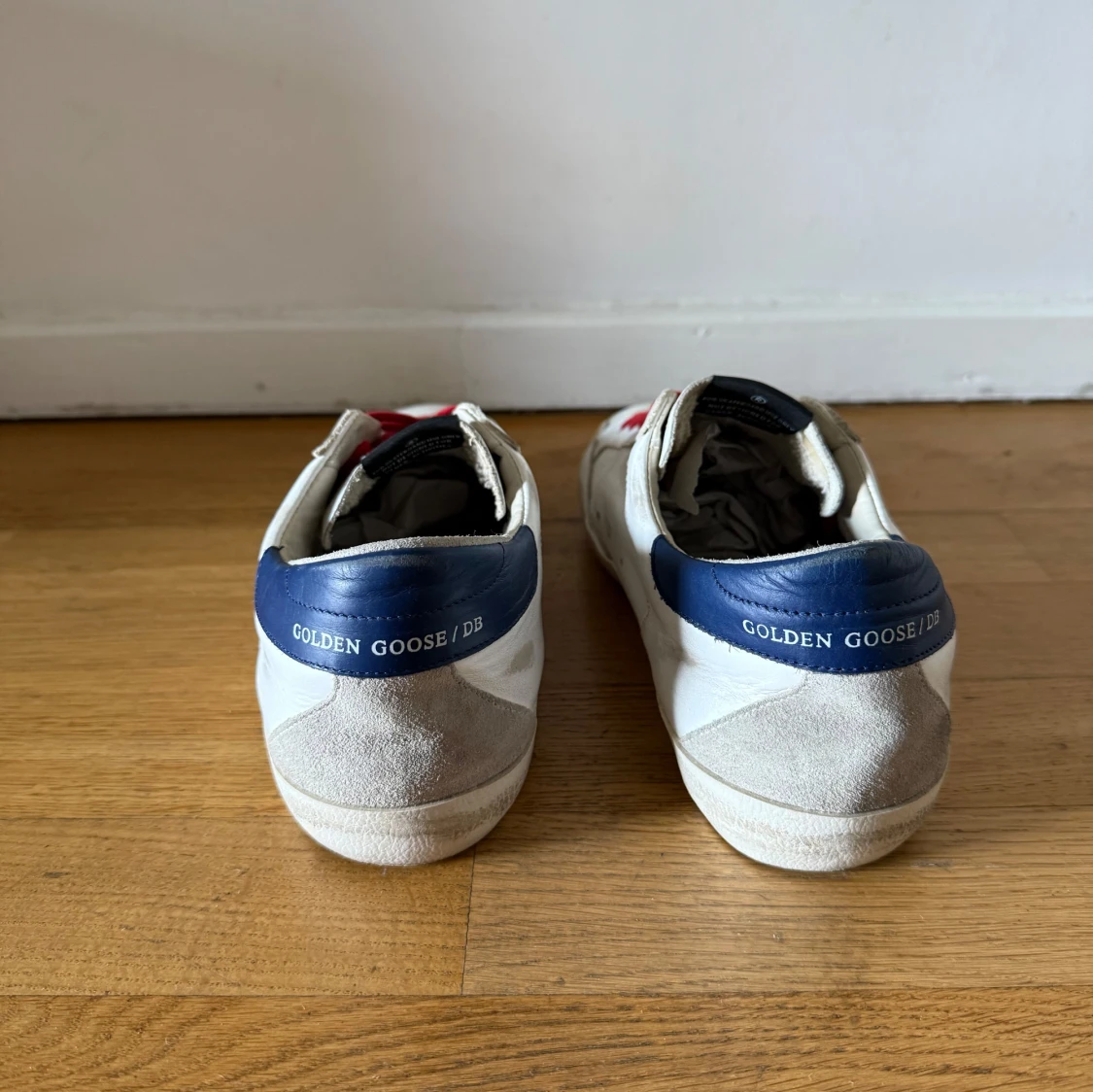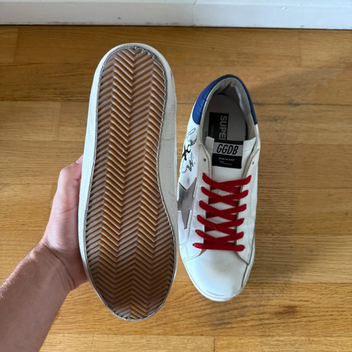 Golden Goose sneakers i vitt skinn med grå stjärndetalj på sidan, blå hälkappa och röda skosnören. Sidan har svart grafittiliknande print och sulan är platt. Märket syns på häl och plös. Perfekta för dig som gillar streetstyle med en twist.