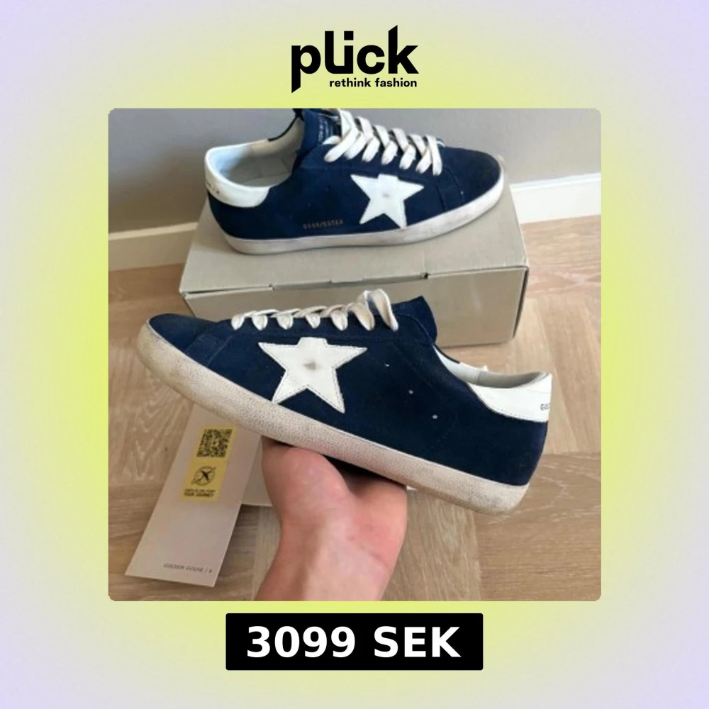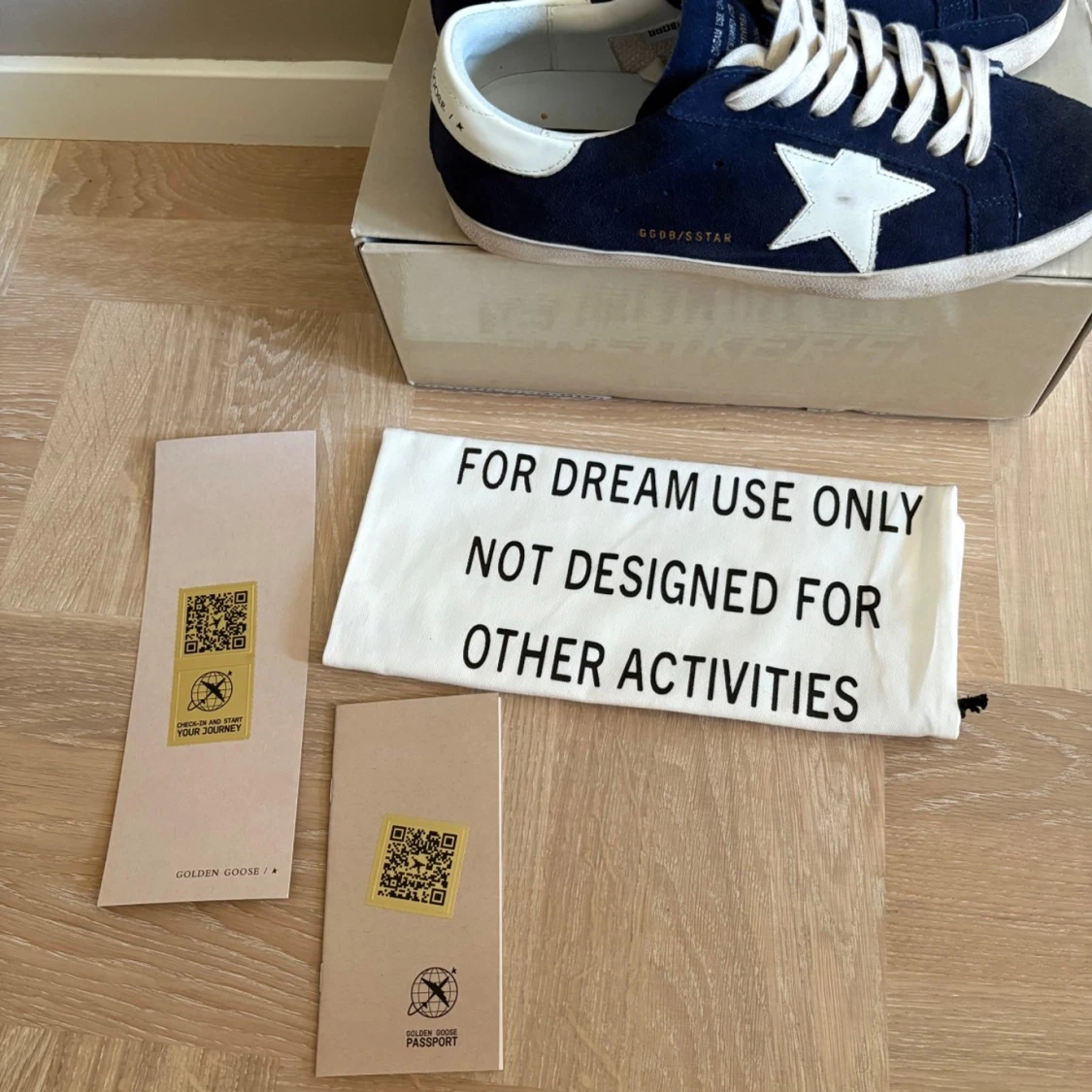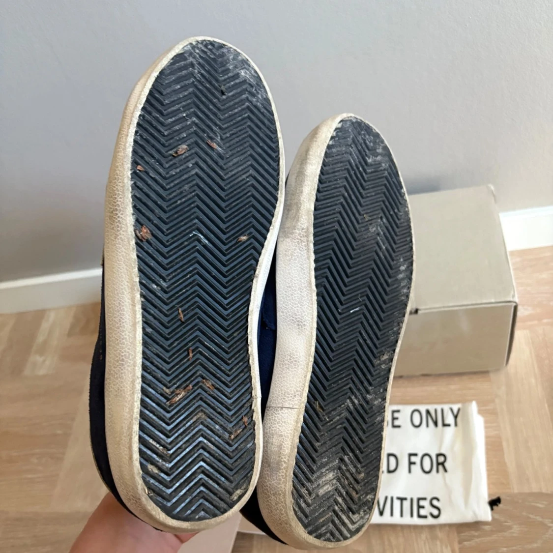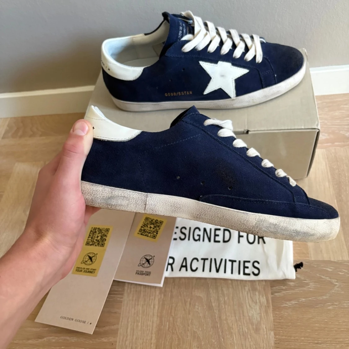 Golden Goose Superstar sneakers i mörkblå mocka med vit stjärndetalj på sidan och vit hälkappa. Nyskick, endast lite smutsiga. Allt og ingår! Storlek 43.