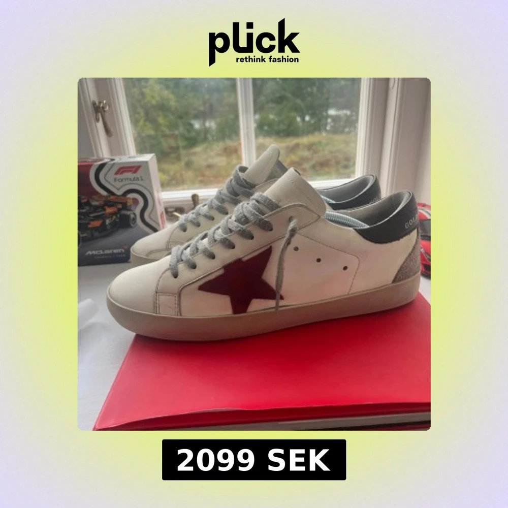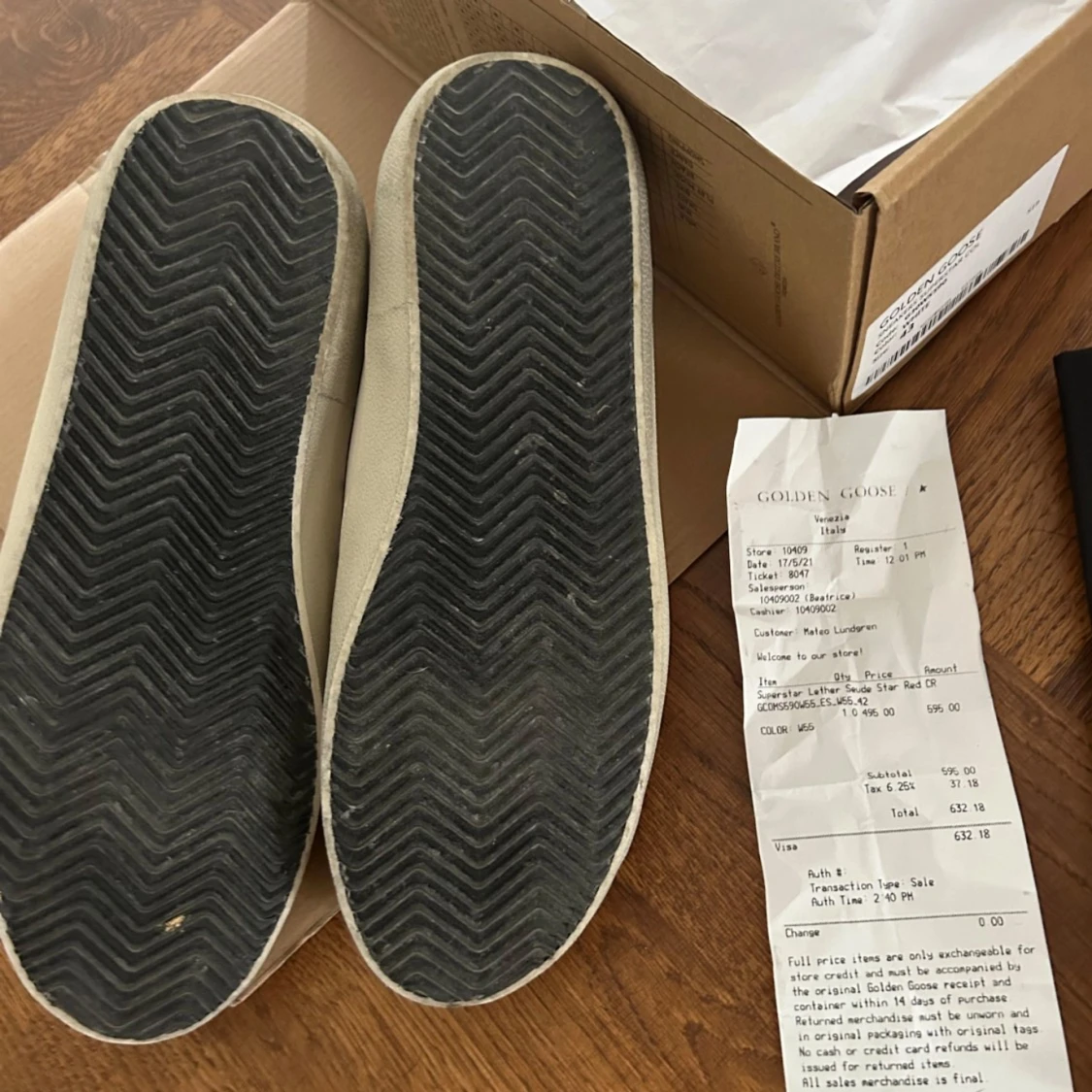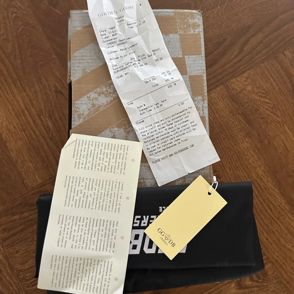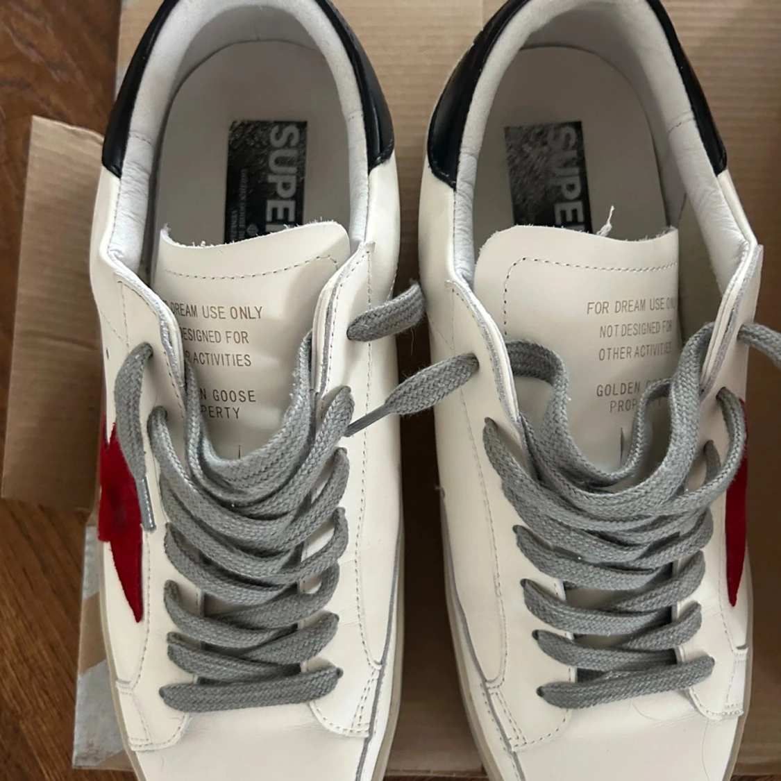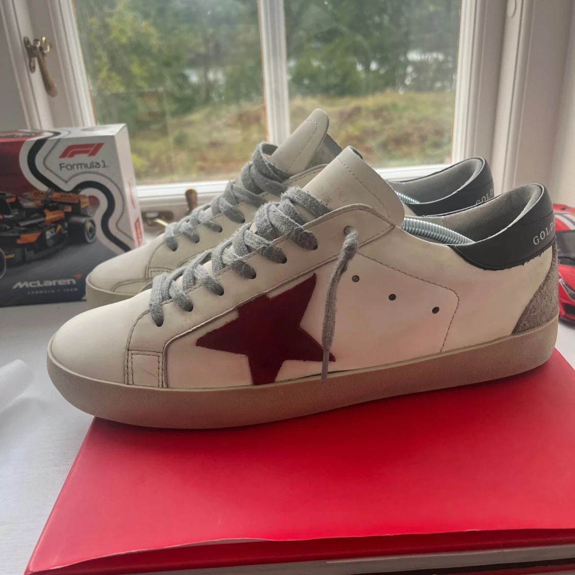 Golden Goose sneakers i vitt skinn med grå snörning, röd stjärna på sidan och svart detalj på hälen. Klassisk rund tå och platt sula. Snygg och ikonisk modell som sticker ut med sin röda stjärndetalj. Kvitto finns.