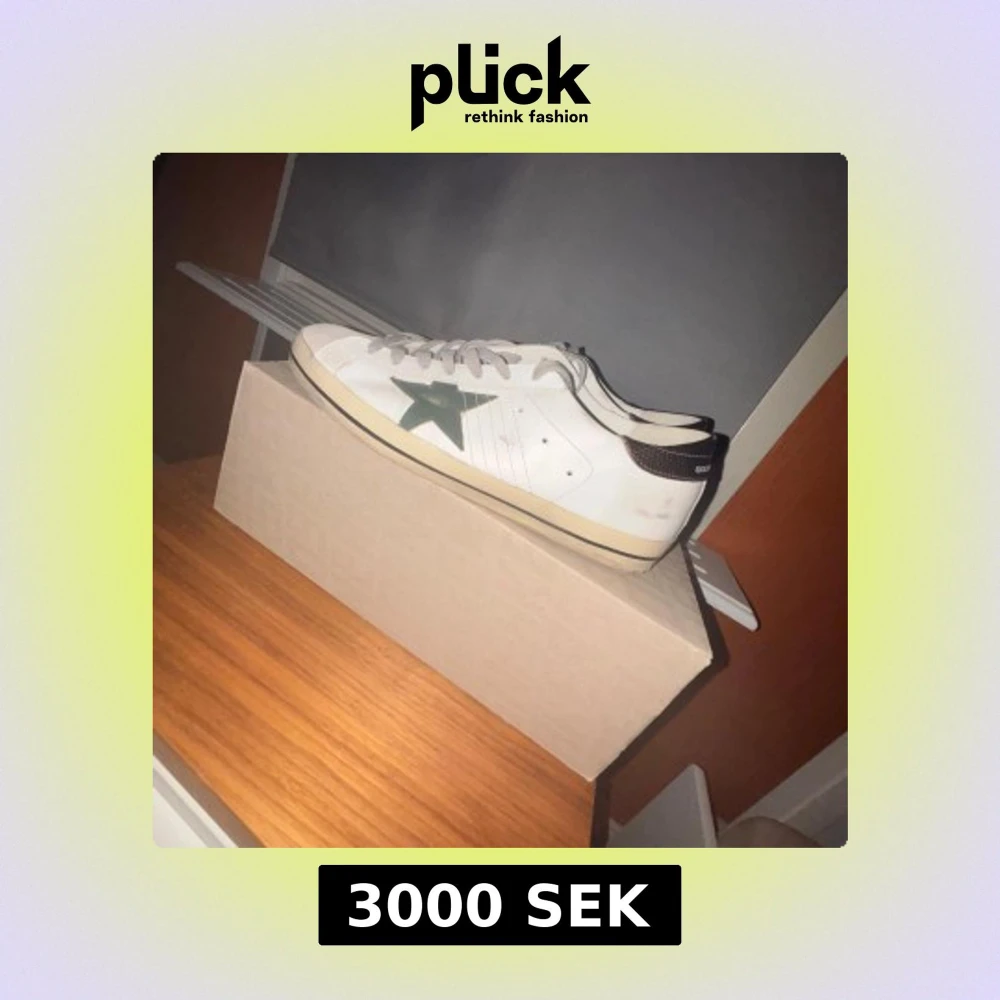Snygga vita sneakers från Golden Goose med en grön stjärna på sidan. Skorna har snörning och en kontrasterande mörk häl. Perfekta för en stilren look. Kan även gå ner i pris. Skorna köptes en månad sen från merchsweden. Pris nya är 4300kr.