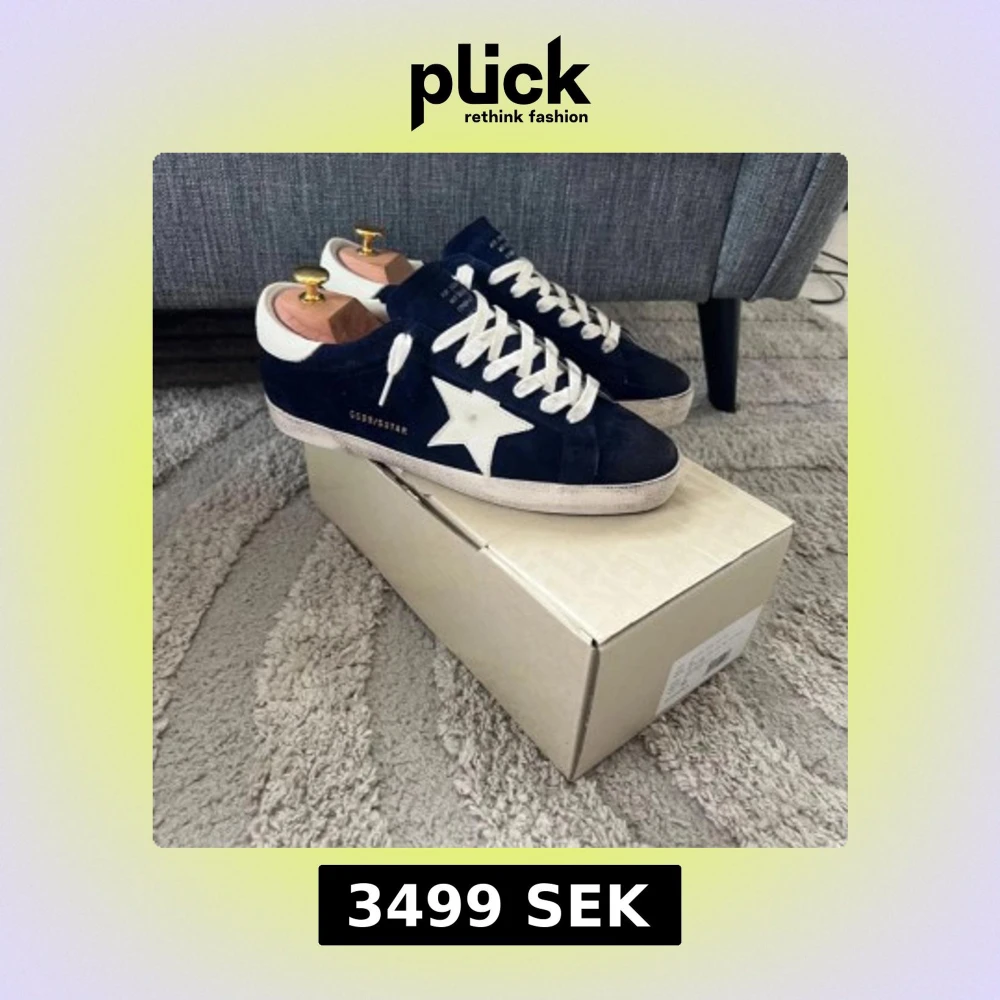 Golden Goose Superstar sneakers i mörkblå mocka med vit stjärndetalj på sidan, vita skosnören och vit sula. Klassisk låg modell med rund tå och retrovibbar. Märkeslogga i guld på sidan och häl. Kommer med originalkartong och dustbag.
