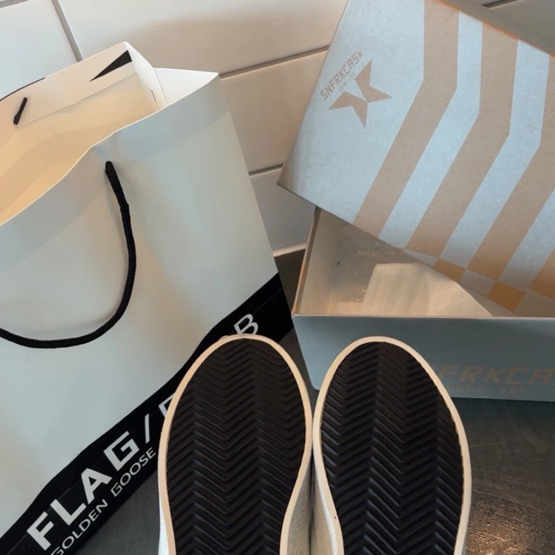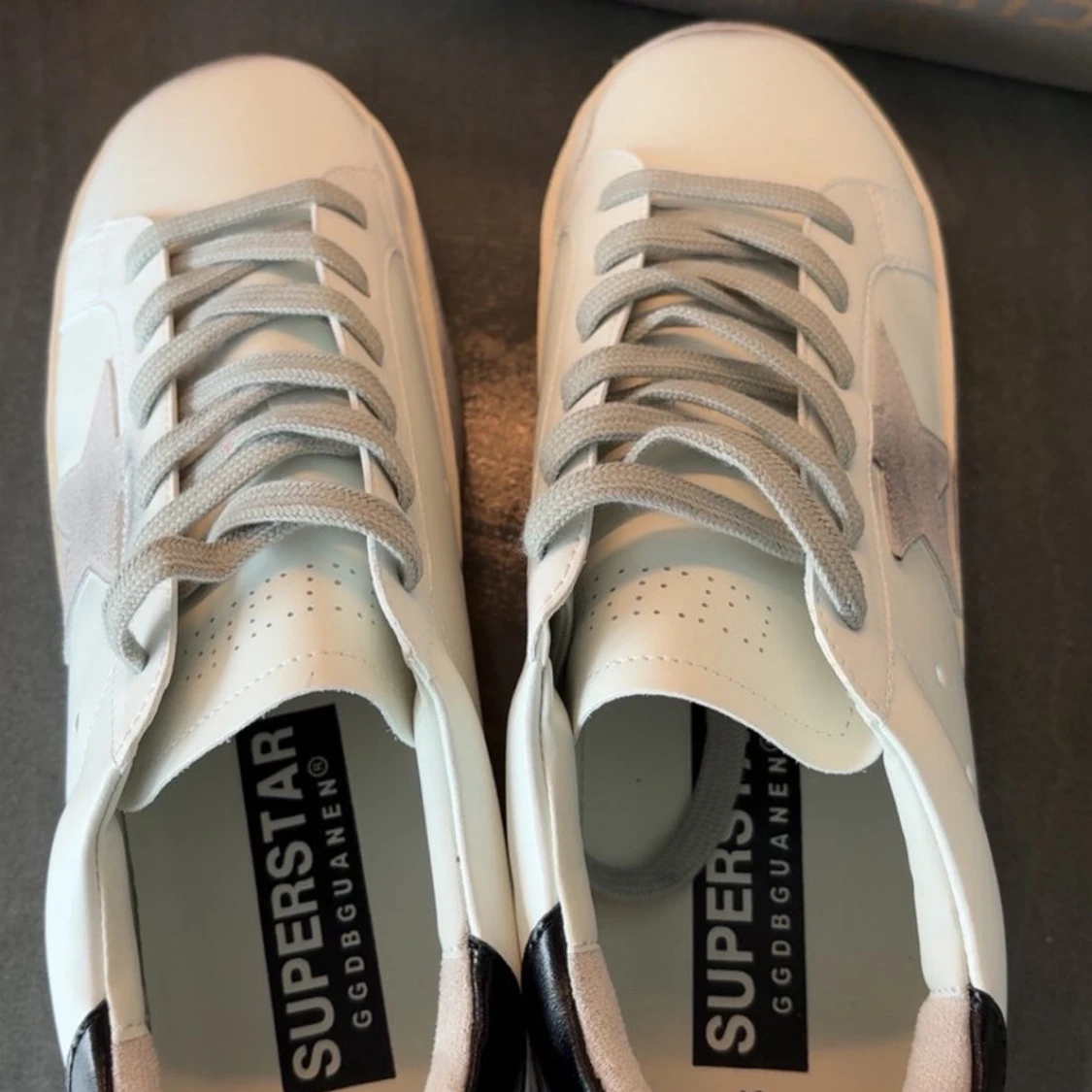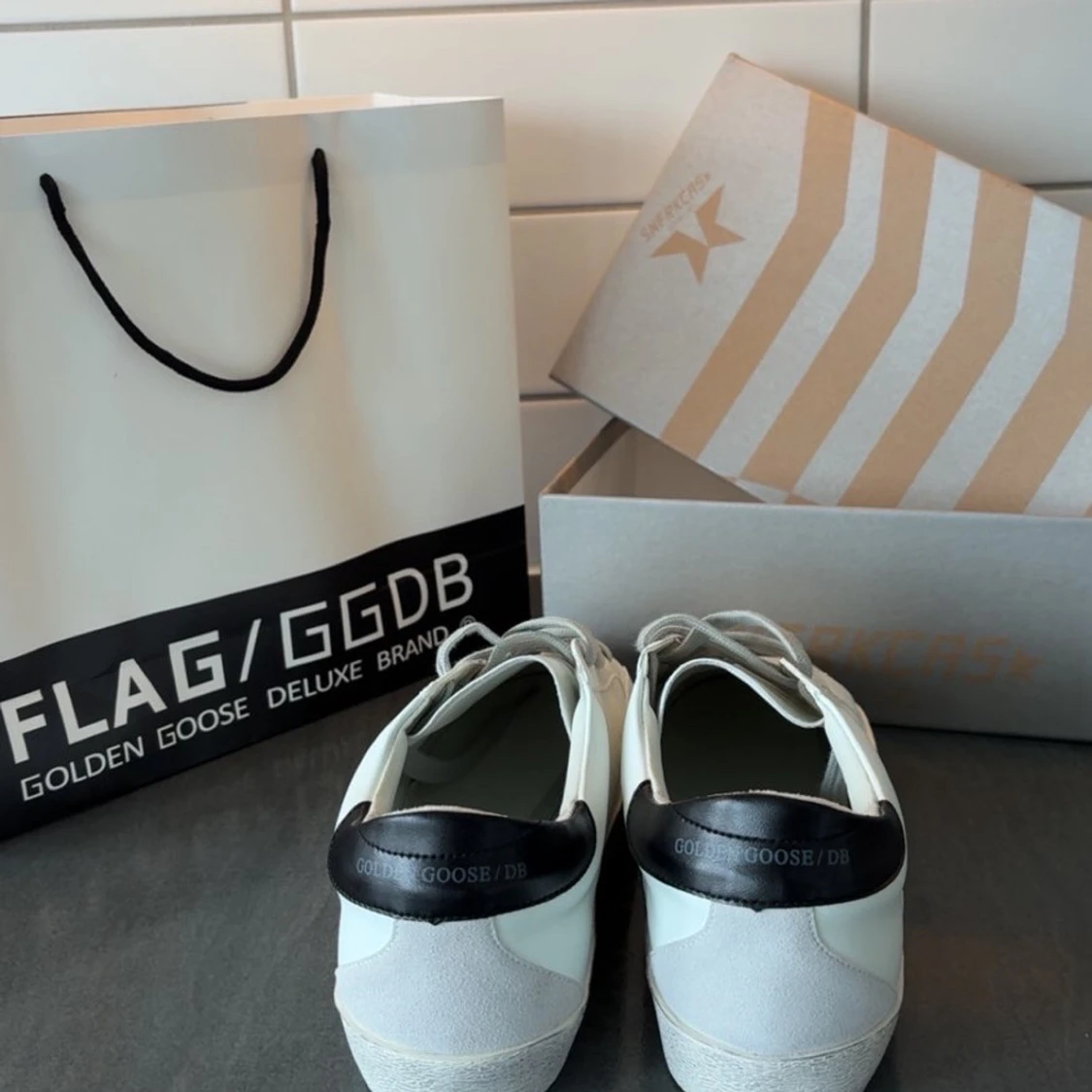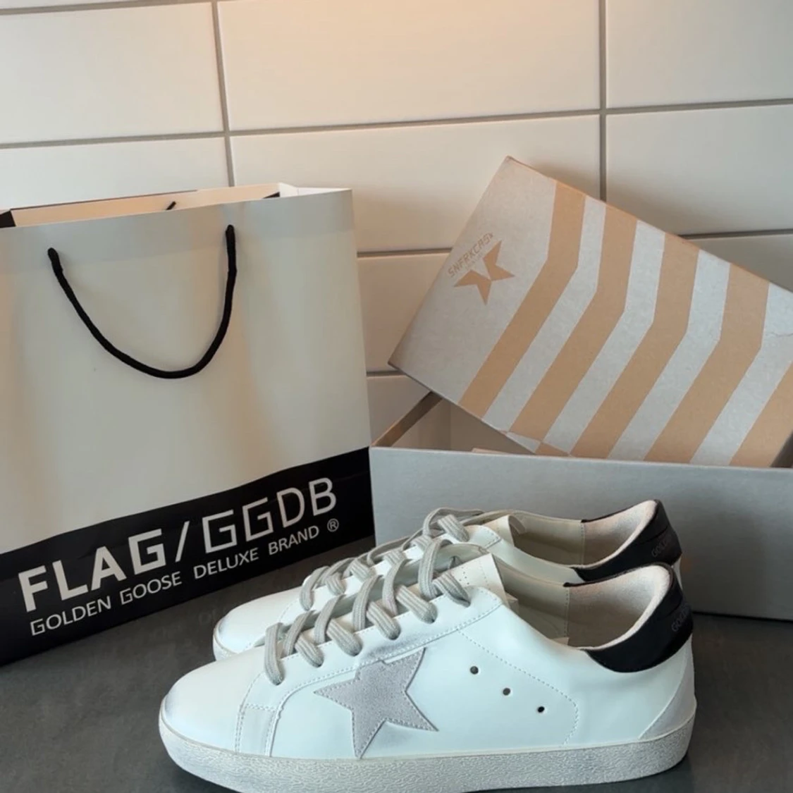 Golden Goose sneakers i vitt skinn med grå mockadetaljer och ikonisk stjärna på sidan. Skorna har grå snörning, svart hälparti med logga och platt sula. Perfekta för dig som gillar stilrena och trendiga sneakers med en lyxig touch.