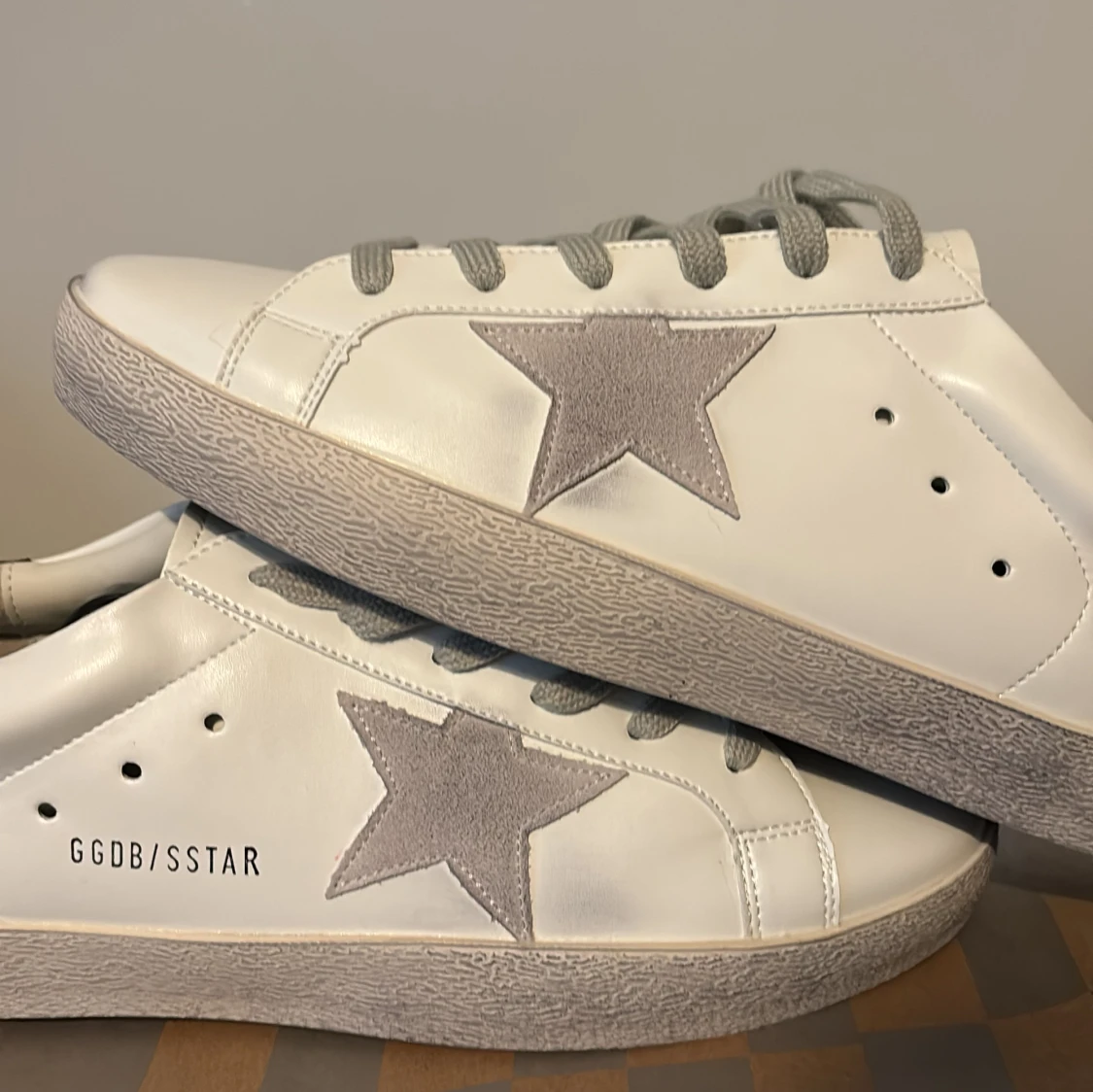 Golden Goose sneakers i vitt skinn med grå mockadetaljer och en stor grå stjärna på sidan. Skorna har grå snörning, svart hälparti och platt sula med mönstrad undersida. Snygg och clean design med GGDB/SSTAR-tryck på sidan. Perfekt för dig som gillar streetstyle.