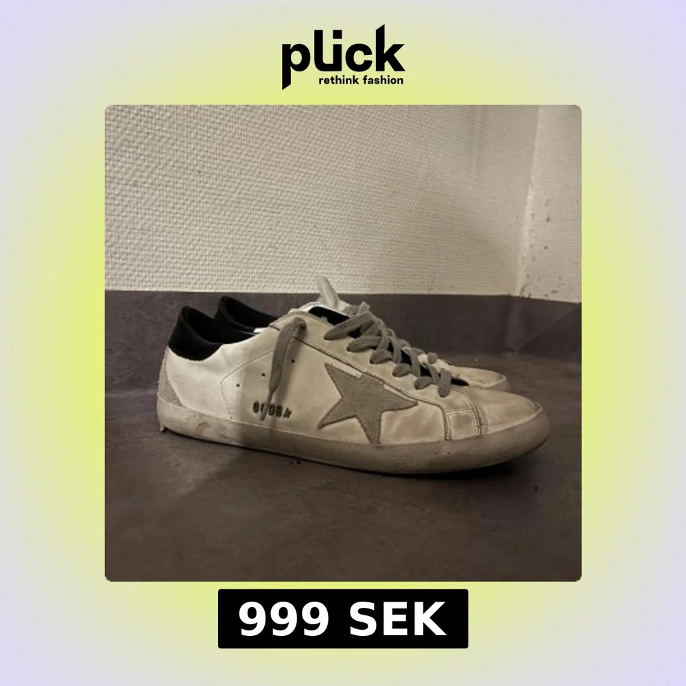 Säljer ett par vita Golden goose Superstar i storlek 43, funkar även som 44. Skorna är relativt fräscha, det ända felet är att sulan har spruckit vid hälen och vid sidan på ena skon. Men detta är ganska vanligt bland Golden goose. Våga buda på priset är inte hugget i sten👍🏻
